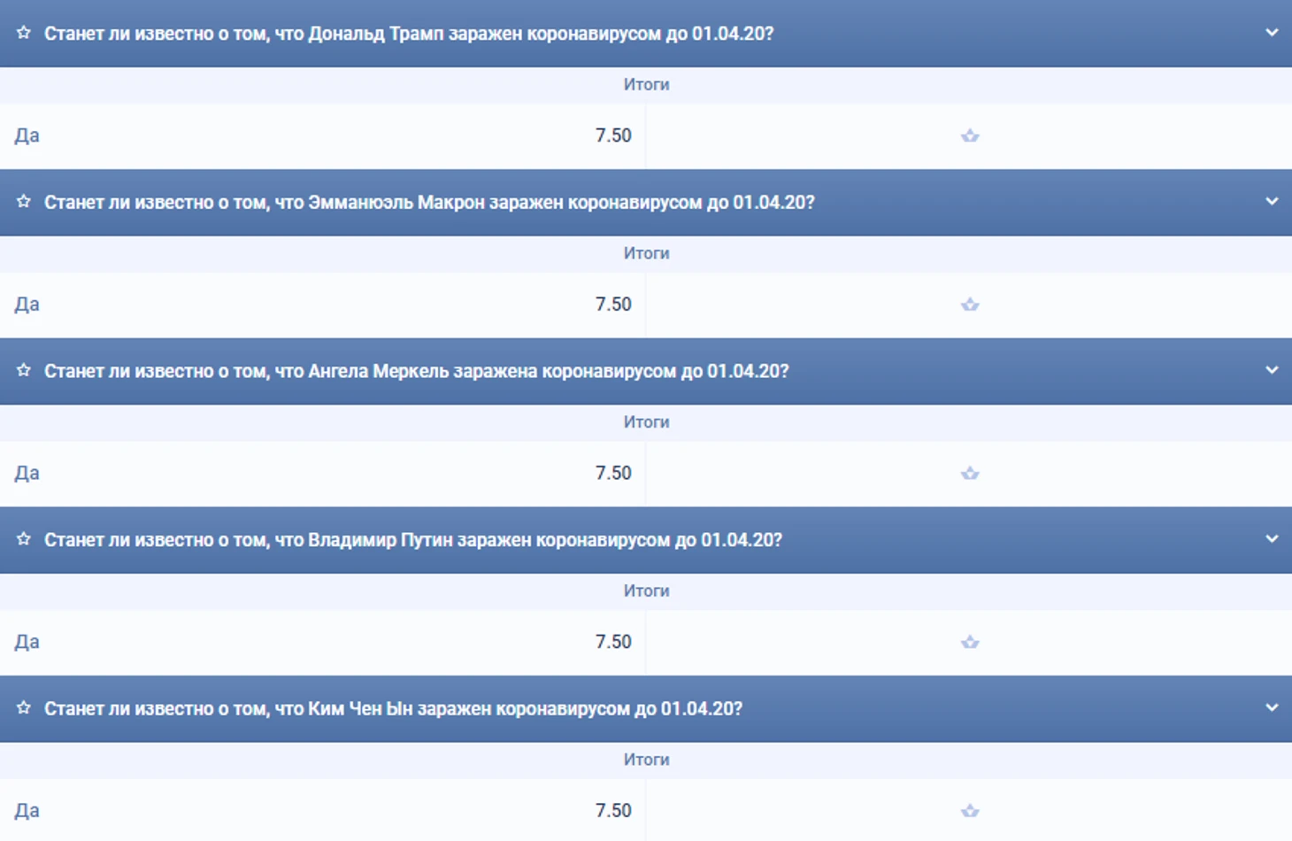 Один букмекер, который, скорее всего, не сильно любит политику, предлагает игрокам заключить пари насчет того, заболеют ли коронавирусом COVID-19 лидеры стран: Дональд Трамп, Эмманюэль Макрон, Ангела Меркель, Владимир Путин и Ким Чен Ын. Букмекер считает, что шансы подхватить заразу у всех политиков одинаковые. Так, к примеру, если игрок сделает ставку размером 100 рублей на того или иного кандидата, то в случае его заражения он получит 750 рублей:
