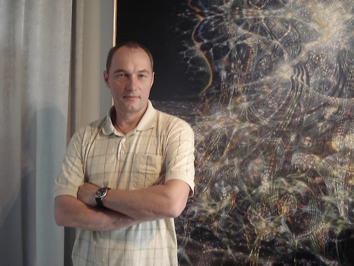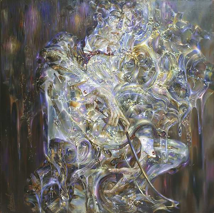 Художник не использует никакие светящиеся краски. Техника у него уникальная, начиная уже с грунтовки холста. Масло, кисть, душа и свет.