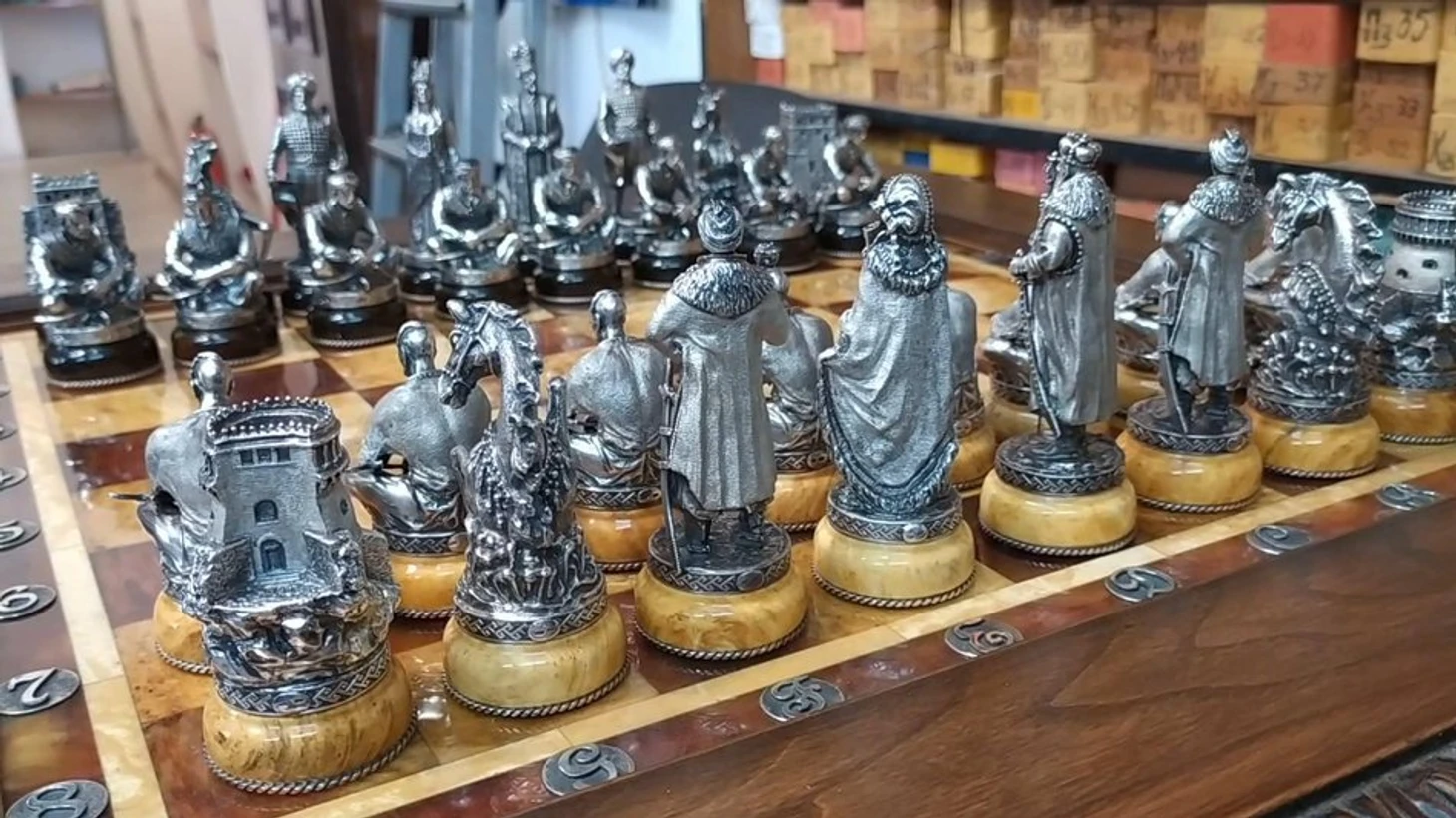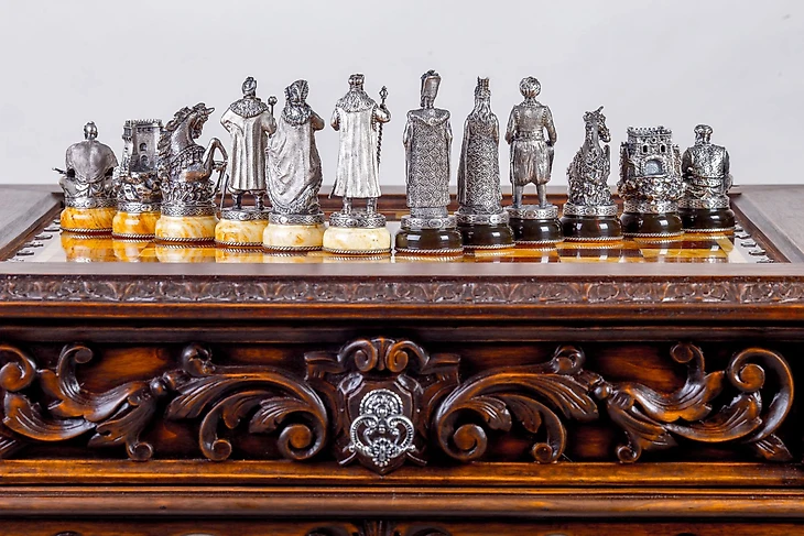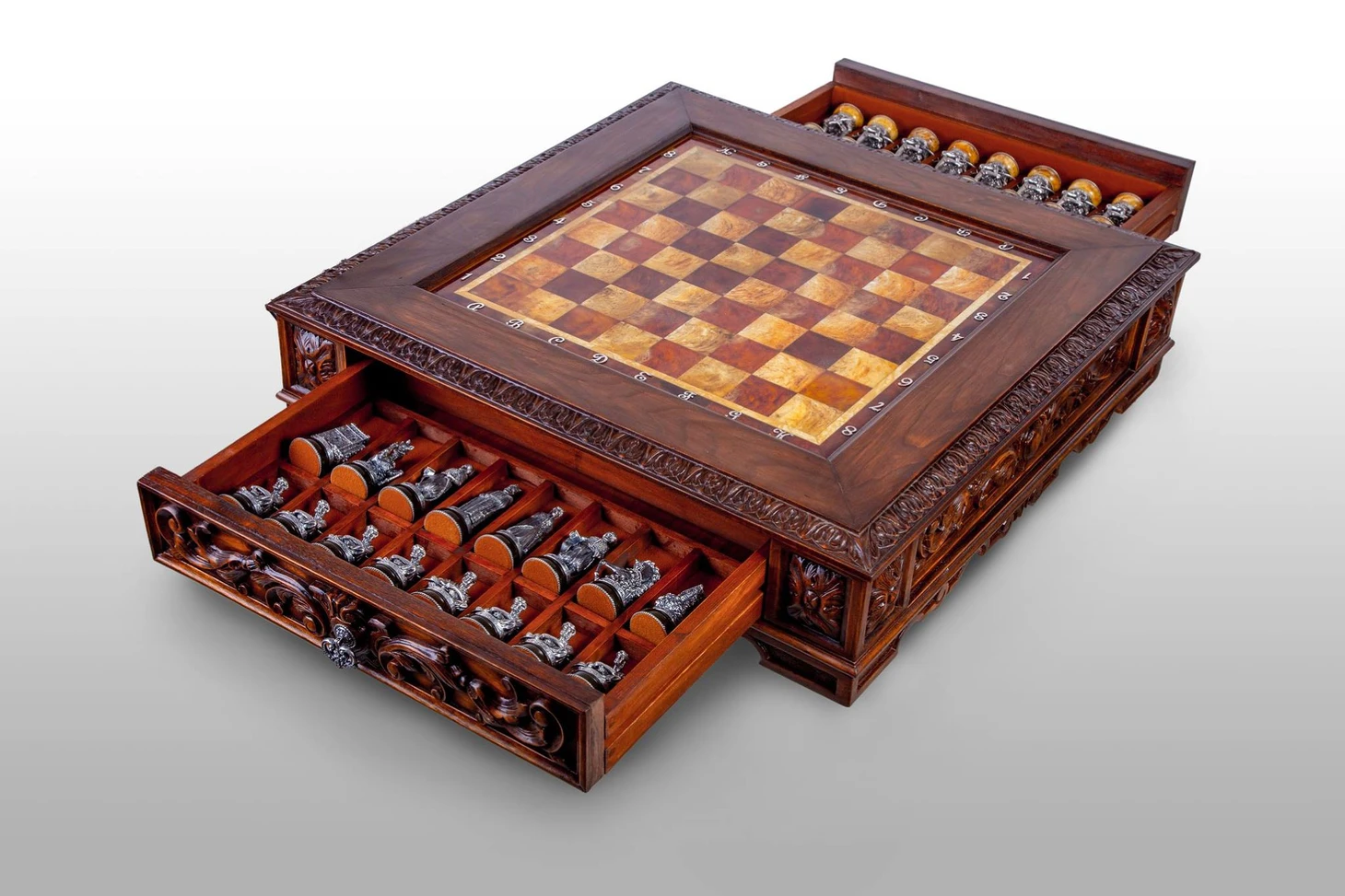 Шахматы помещаются в два ящика резного из орехового дерева стола, инкрустированного янтарем.