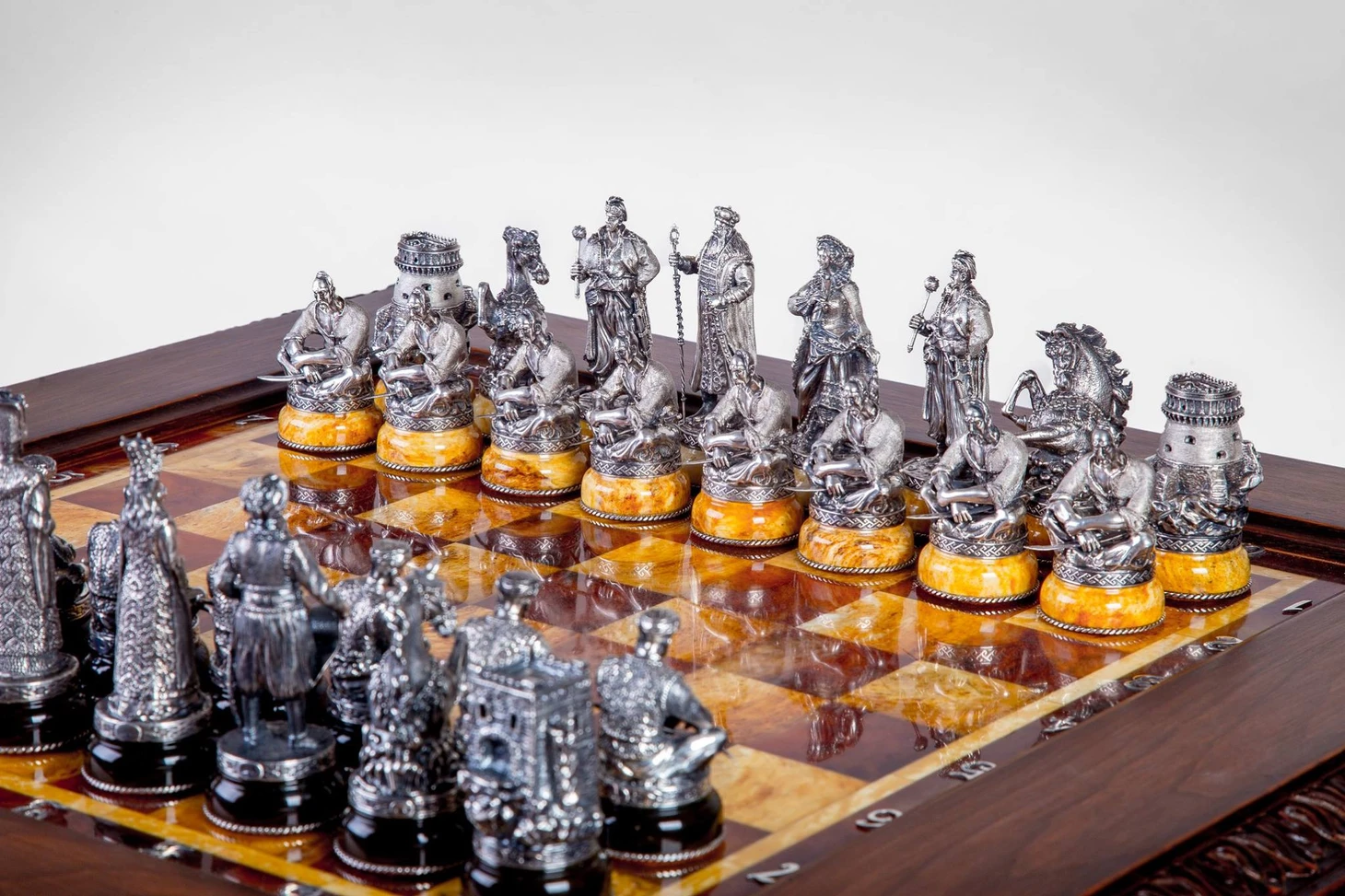 К 100-летию Острожского историко-культурного музея-заповедника ювелир из Славуты Август Вольский изготовил из серебра и янтаря.сувенирные шахматы и шахматную доску.