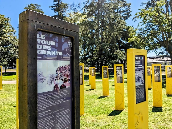В саду на месте старого велодрома По стоят двухметровые статуи или тотемы, а кто-то их даже называет могилами, на которых изображены фотографии, указаны имя и фамилия победителя Тура конкретного года, а также написан небольшой пояснительный текст. Кроме того, там есть некоторые статистические данные, динамические фотографии и, разумеется, QR-код, отсканировав который можно прослушать текст на подходящем тебе языке, хотя, насколько знаю, выбор достаточно скуден. Если посмотреть сверху на произведение искусства, то выходит такая желтая спираль, которая с каждым годом только удлиняется в связи с появлением нового чемпиона.