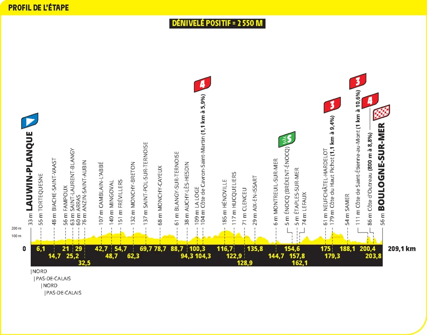 Спуск с холма ведет в рыболовецкий городок Булонь-сюр-Мер, который играет особыми красками в сентябре, когда здесь проходит фестиваль «Короля селедок», когда местные умельцы жарят рыбу на гигантских решетках и подают с бокалом вина. Впрочем, пока до этого далеко, поэтому отметим, что подъезд к финишному створу по городским улицам будет равнинным, однако, на последнем километре дорога снова возьмет немного вверх с градиентами в районе 5%. Так что, чистых спринтеров в развязке второго этапа организаторы не ждут, но умение быстро финишировать из усеченной группы вполне может пригодиться. Разумеется, если только Погачар от всех не ускачет на коротких, но крутых подъемах.