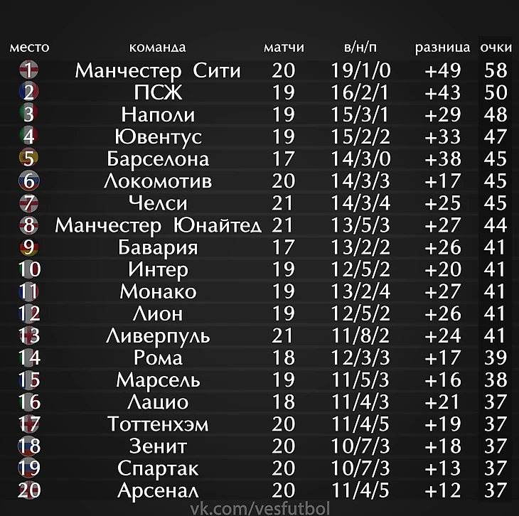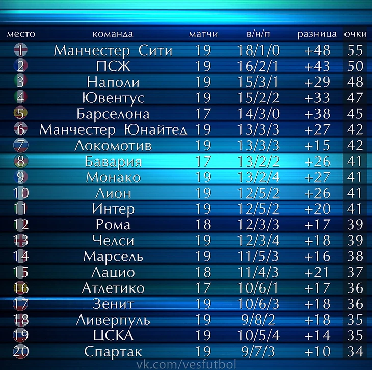 Первая таблица - после 19 тура, вторая - таблица на 31 декабря. При равенстве очков у команд первый учитываемый показатель - количество игр, второй - забитые мячи. Ещё хотелось бы у Вас узнать, какой вариант оформления (синий или тёмный) Вам нравится больше, об этом пишите в комментарии!