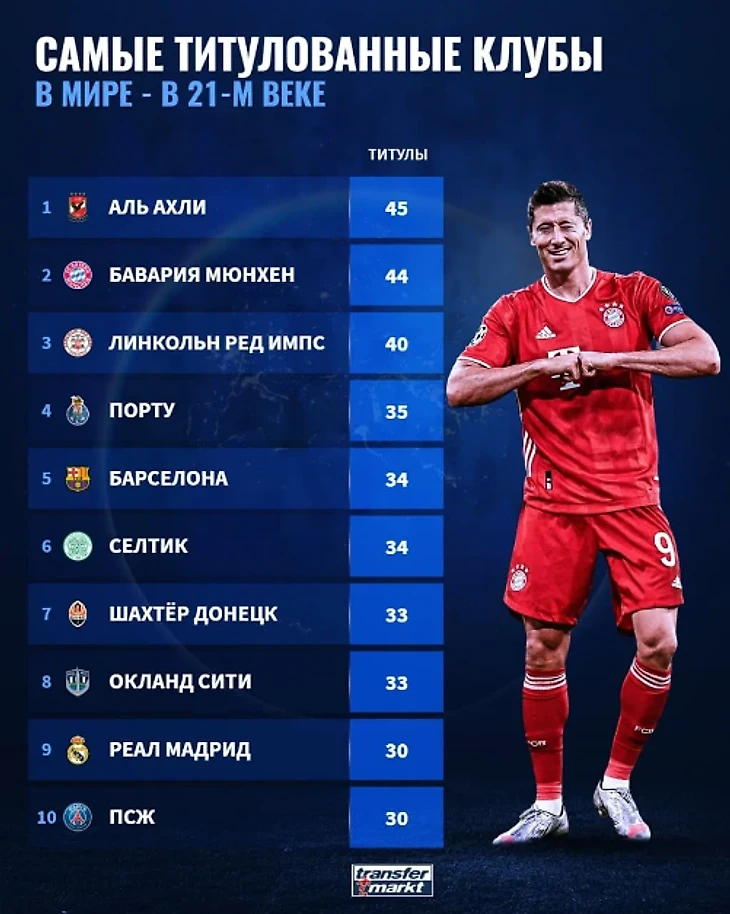 Наибольшее количество титулов завоевал египетский клуб «Аль-Ахли» – 45, у немецкой «Баварии» – 44, у «Линкольна Ред Импс» из Гибралтара – 40. Выше «горняков» оказались ещё три футбольных клуба – «Порту» (35), испанская «Барселона» (34) и шотландский «Селтик» (34).