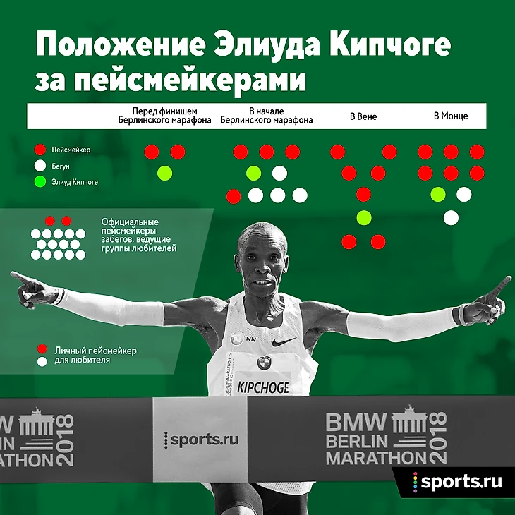 Регламент большинства соревнований разрешает пейсерам бежать только с самого начала забега. То есть начать бежать с середины дистанции формально нельзя. Именно поэтому венский рекорд Элиуда Кипчоге не является официальным – вокруг него свита из семи бегунов обновлялась каждые пять километров. Это и позволило свежим пейсерам держаться в темпе выше официального мирового рекорда, поставленного тем же Элиудом Кипчоге (2 часа 1 минута 39 секунд) на Берлинском марафоне 2018 года.