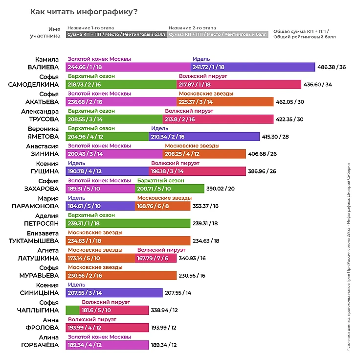 В этом сезоне прошло 5 этапов Гран-при России из 6. В каждом этапе участники набирают рейтинговые баллы за занятые места: 18 баллов за первое место и 1 балл за 10-е. При равенстве рейтинговых баллов в расчет идет сумма оценок за все программы. Спортсмены могут принять участие в двух этапах, а от суммы набранных баллов будет зависеть выступление в финале Гран-при, который пройдет в Сочи в марте 2023 года.