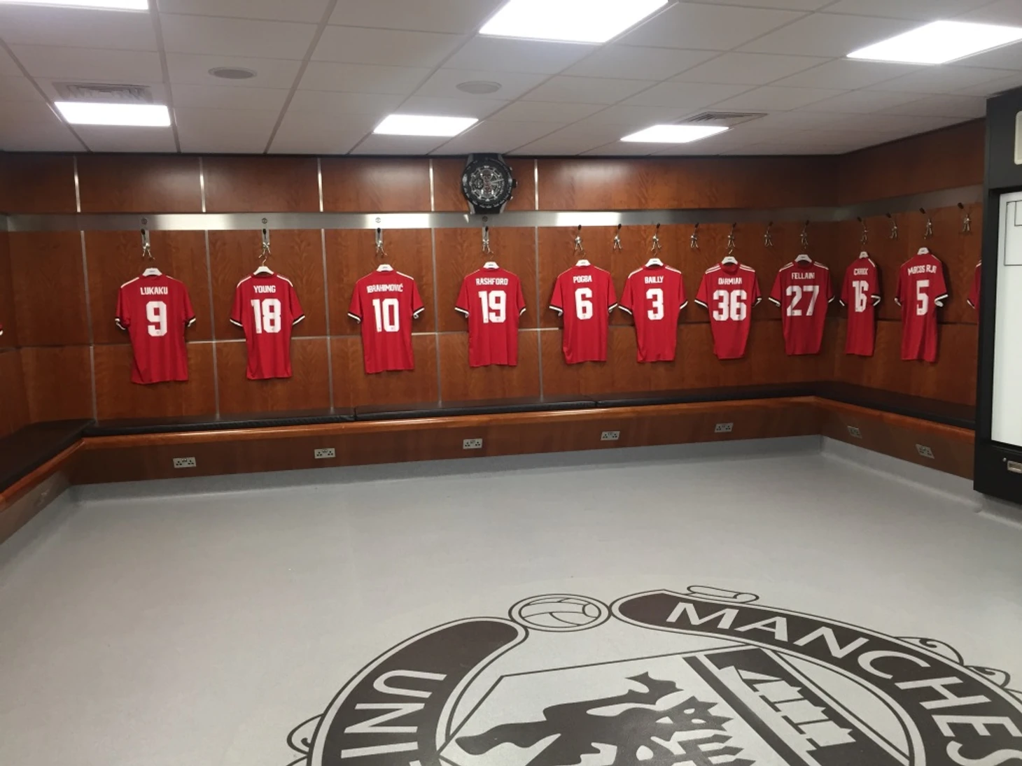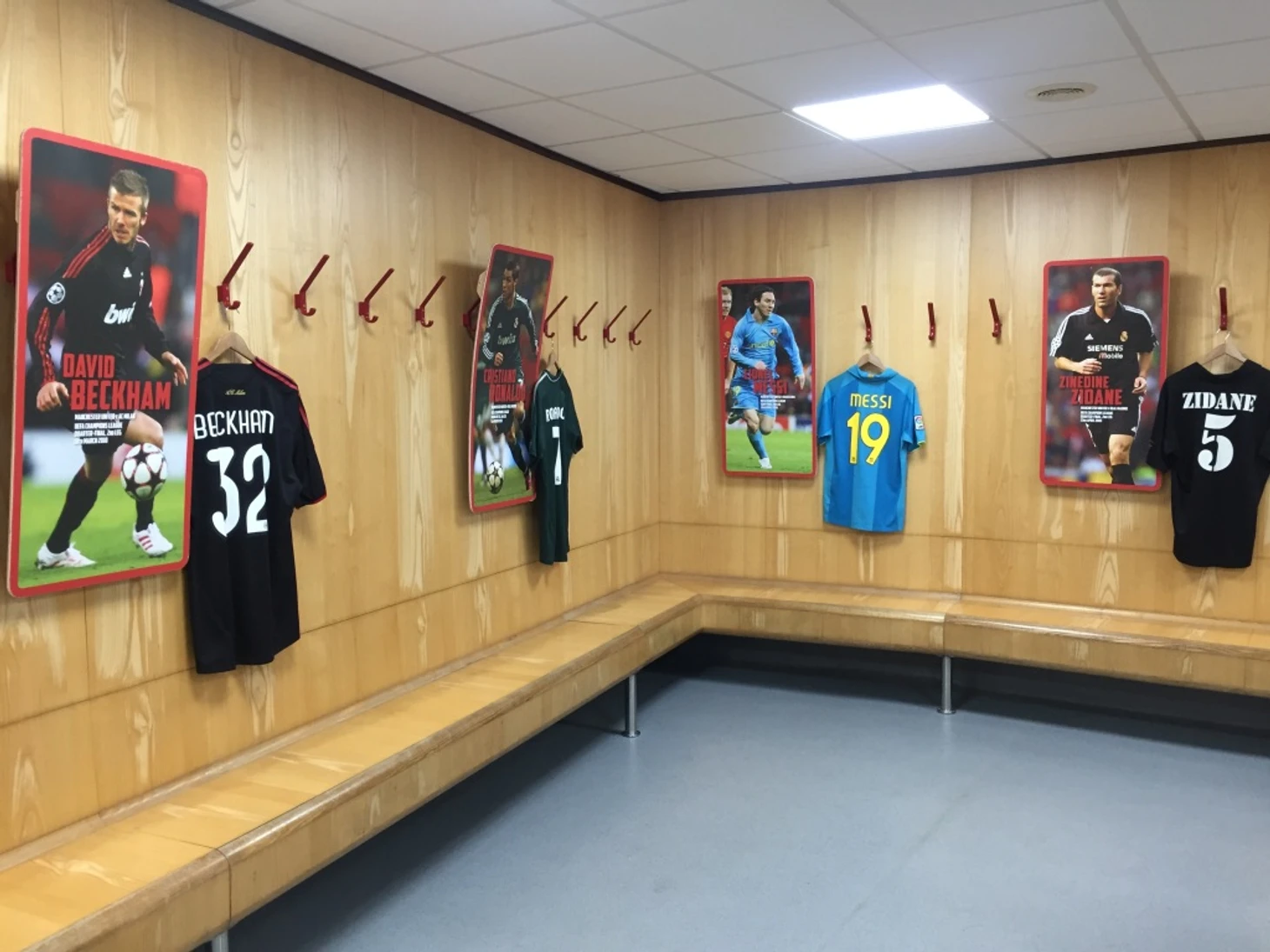 Гостевая раздевалка украшена футболками и портретами самых звездных людей, которые сюда когда-либо заходили – Бекхэма (играл против «МЮ» в составе «Милана»), Роналду (приезжал в Манчестер с «Реалом»), Гиггза (проигрывал англичанам в матче сборных), Зидана и Месси. Из неожиданных персонажей – Джона Лому, бывший игрок сборной Новой Зеландии по регби, который скончался три года назад, и легенда женской сборной США Эбби Вамбах. Никаких напитков и сэндвичей здесь не найти – «Юнайтед» не хочет, чтобы после матчей соперники обвиняли клуб в просроченных или отравленных блюдах.