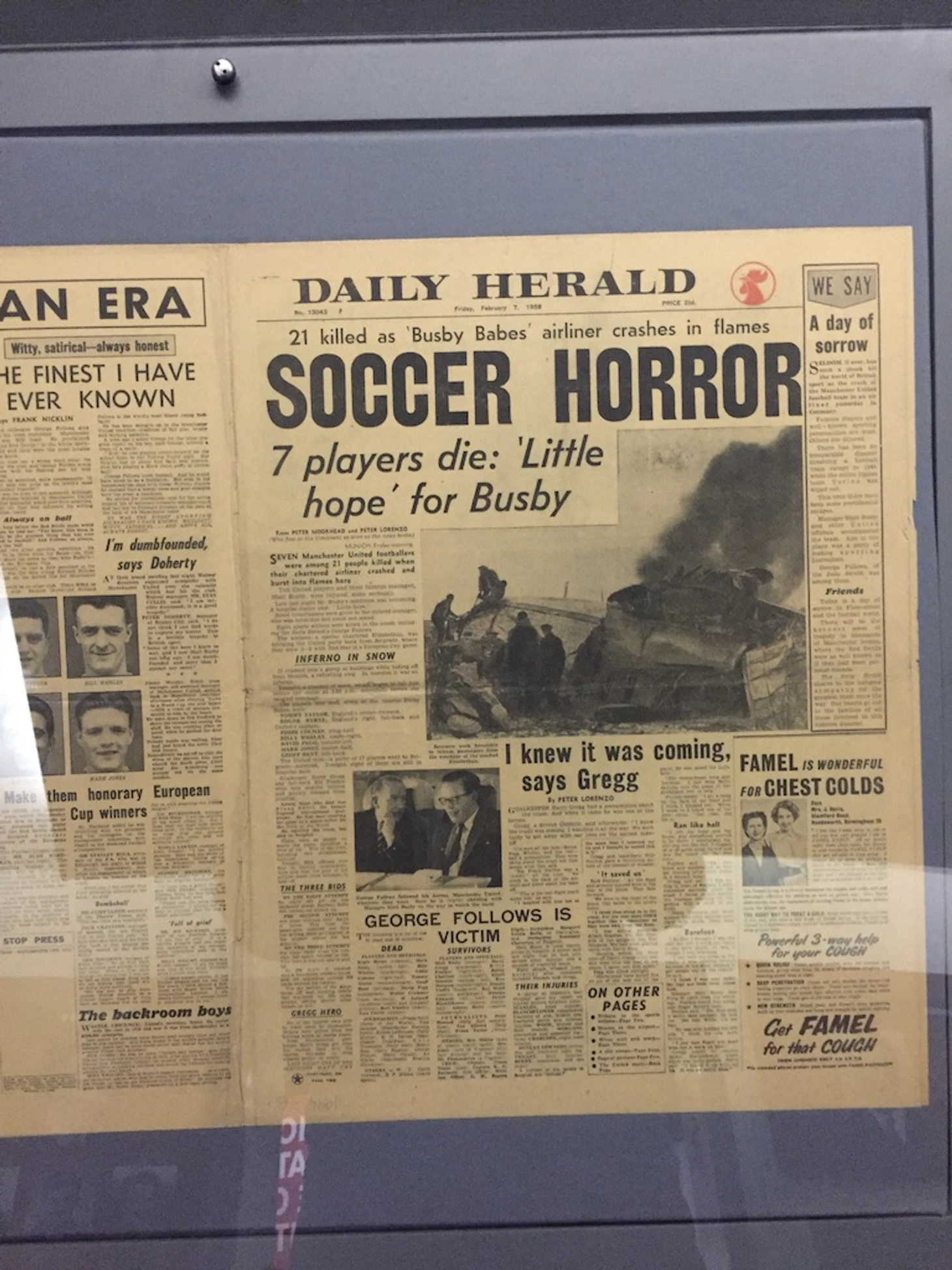 Отдельный зал посвящен мюнхенской трагедии: имена, футболки и трофеи Малышей Басби, страшные видео и газетные полосы.