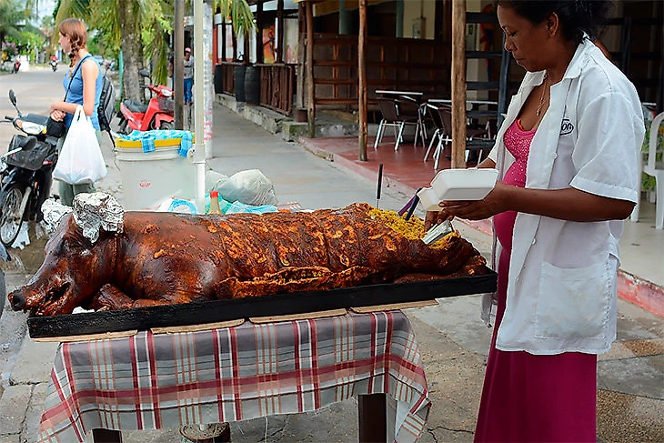 Радамель Фалькао давно стал в Колумбии супергероем, а Хамеса Родригеса вообще тяжело не любить – но в плане популярности и тот, и другой явно проигрывают лечоне, идеальному футбольному блюду, которое традиционно заказывают по дороге с матча. Лечона – это молодой поросенок, из которого выпотрошили весь фарш, зажарили его с желтым рисом, горохом, зеленым луком и перцем, а затем снова упаковали в тушу и отправили в печь на десять часов.