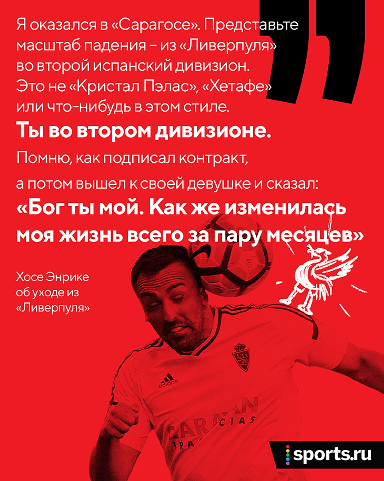 – Сейчас буду честным, никогда не рассказывал об этом раньше. В общем, после «Ливерпуля» я оказался в «Сарагосе». Представьте себе масштаб падения. Ты приезжаешь из «Ливерпуля» во второй испанский дивизион. Это не «Кристал Пэлас», «Хетафе» или что-нибудь в этом стиле. Ты во втором дивизионе. До сих пор помню, как подписал контракт, а потом вышел к своей девушке и сказал: «Бог ты мой. Как же изменилась моя жизнь всего за пару месяцев». Полное безумие. Но я решил дать этой истории шанс. Решил поиграть год и посмотреть, что из этого выйдет.
