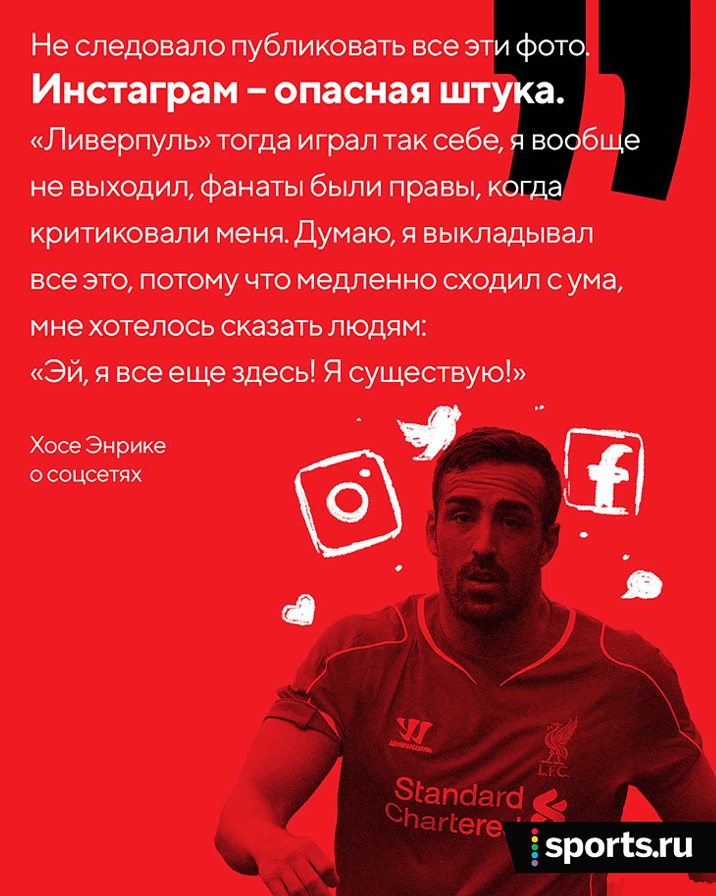 – Это была моя ошибка. Не следовало публиковать все эти фотографии. Инстаграм – опасная штука. «Ливерпуль» тогда играл так себе, я вообще не выходил на поле, так что все эти фотографии… в общем это было плохое решение. Фанаты были абсолютно правы, когда критиковали меня. Думаю, я выкладывал все это, потому что медленно сходил с ума из-за невозможности играть и мне хотелось сказать людям: «Эй, я все еще здесь! Я существую!» Но это было неверно. Иногда не понимаешь всю силу соцсетей.