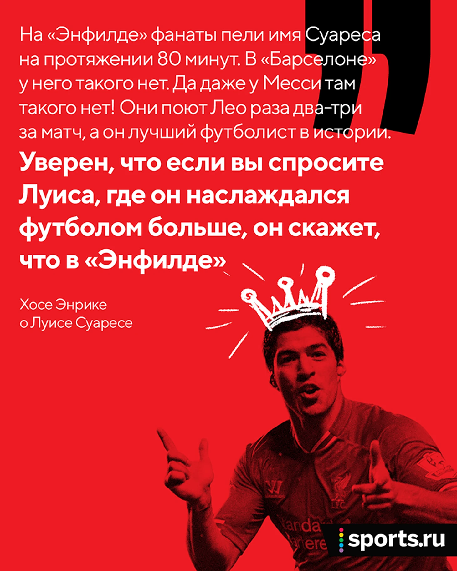 А потом вы смотрите на «Энфилд», где поют целый матч. И, учитывая, что Суарес тогда был нашим лучшим игроком, ему вообще пели без перерыва. Поэтому я уверен, что если вы его спросите, где он наслаждался футболом больше – в «Ливерпуле» или «Барселоне», я уверен, он скажет, что в «Ливерпуле». Несмотря на то, что сейчас он играет с лучшим в мире и берет трофеи.