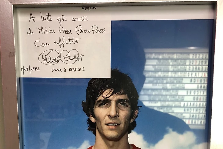 Свой кусок маргариты в Pizza Mitica («Мифическая пицца») я все же заполучил – а пока итальянцы колдовали на кухне, заметил на стене не только винтажную обложку Gazzetta Dello Sport и фотографии с той игры, но и небольшое послание пиццайолам от самого Паоло: «Всем друзьям из Pizza Mitica… С любовью, Паоло Росси». Судя по дате, Росси заглянул сюда около года назад – всего за пару месяцев до смерти.