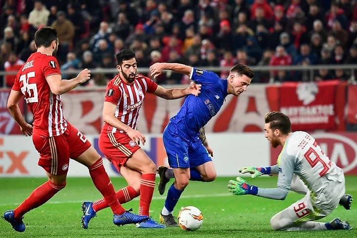 Первая встреча между этими командами состоялась в 1/16 финала Кубка Чемпионов 1975/1976. В первом матче, проходившим Греции, киевляне благодаря голам Виктора Колотова и Леонида Буряка уже к тридцатой минуте вели 2-0, но победу удержать не сумели. В составе "Олимпиакоса" голами отметились Михалис Критикопулос и Константинос Айдиниу на 35-й и 63-й минутах соответственно. Две недели спустя "Динамо" обыграло "Олимпиакос" в Киеве 1-0 благодаря голу Владимира Онищенко на 66-й минуте и вышло в следующий раунд Кубка Чемпионов.