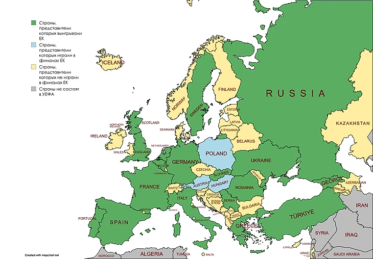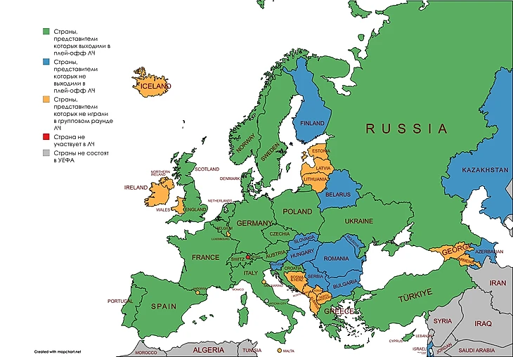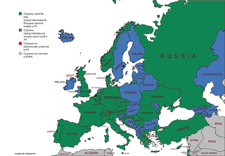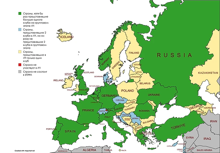 Эта карта прекрасно известна тем, кто открывал в «Википедии» статью про историю и статистику главного еврокубка. Как видно, до группового этапа еще не добрались представители Исландии, Фарерских островов, Андорры, Люксембурга, Сан-Марино, Мальты, Грузии, Армении, Литвы, Латвии, Эстонии, Черногории, Гибралтара, Боснии и Герцеговины, Косово, Албании, Македонии, Ирландии, Уэльса и Северной Ирландии.