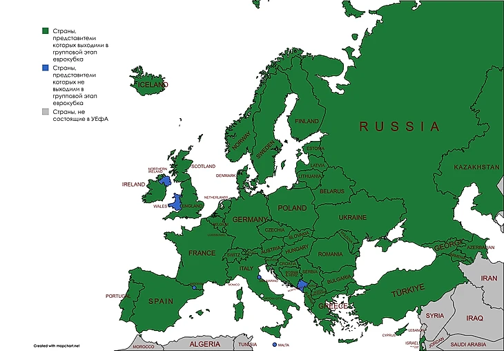 На этой карте отмечены страны, клубы из которых принимали или не принимали участие в групповом этапе какого-либо еврокубка – Лиги Чемпионов, Лиги Европы или Лиги Конференций. С каждым годом список стран, чьи представители еще не выходили в групповой раунд еврокубка, сокращается. До группового этапа Лиги Конференций добирались даже представители Гибралтара и Лихтенштейна.