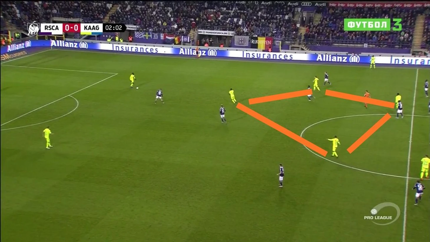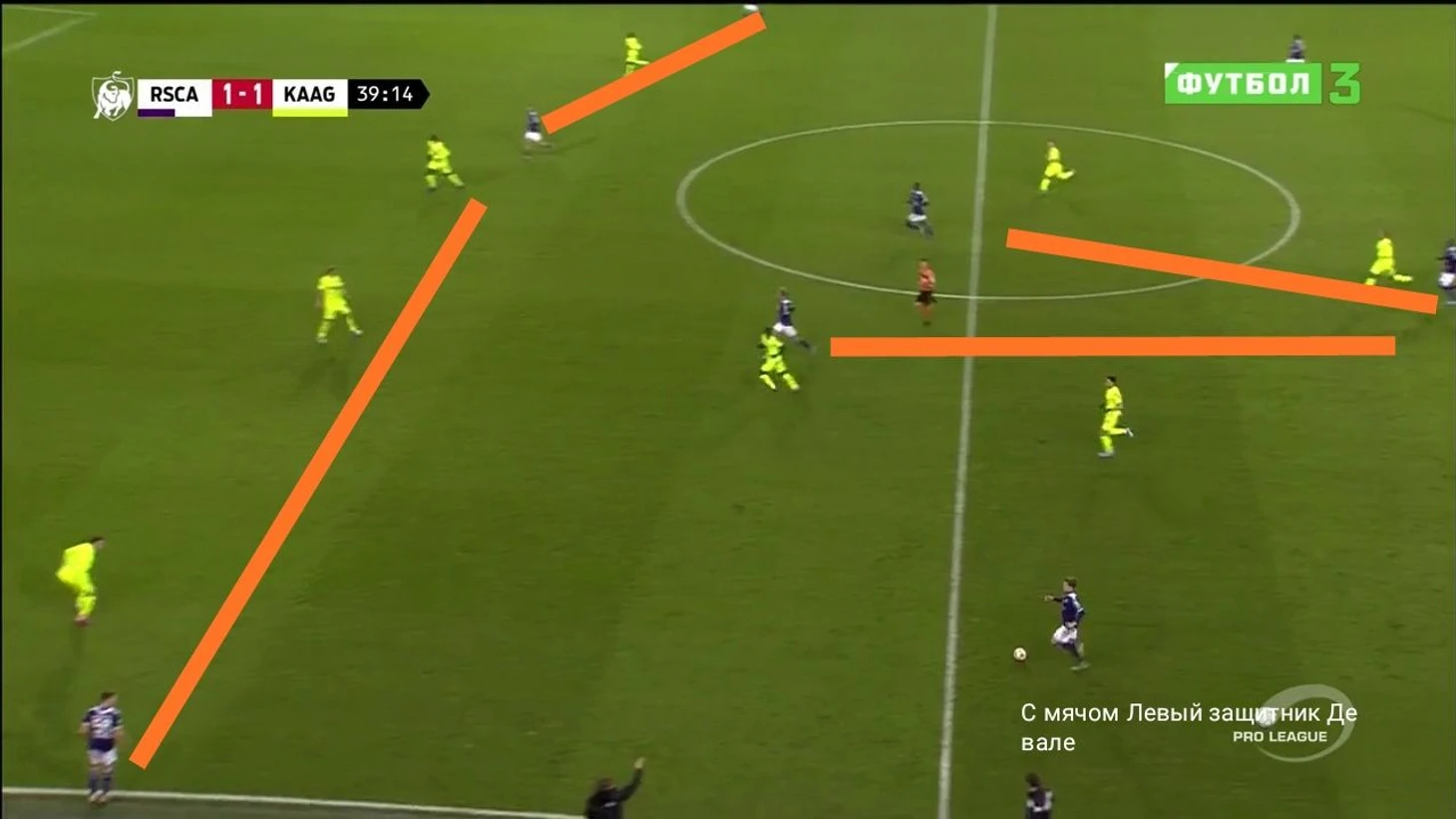 Но из владения они извлекли мало остроты, а в результате контратаки забил "Андерлехт" - Салемакерс подхватил мяч, сместился в центр и отдал на подключившегося на фланге центрального защитника Коббаута (помимо того, что он отдал голевой пас, так ещё и с его отбора началась сама контратака), последовал прострел на пустые ворота, где вовремя оказался Версхарен. Однако "Гент" быстро отыгрался - Одиджа-Офоэ исполнил классную передачу в штрафную на Депуатра, которого упустил Кама. Через 5 минут и вовсе гости могли выйти вперед, но свой момент не реализовал Яремчук. В последнюю треть тайма активнее в атаке была команда Франка Веркаутерена. При построении атак они выстраивались в 4-3-3, разгонял атаки шестёрка Кайембе, выше в полузащите располагались: левее - Влап (без мяча он поднимался выше к нападающему, формируя 4-4-2), правее - Локонга, левый атакующий полузащитник - Салемакерс, правый - Версхарен, в нападении - Руф. В конце тайма создали неплохой удар из штрафной, но гостей спас Камински. Ничья после первого тайма.