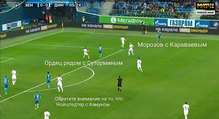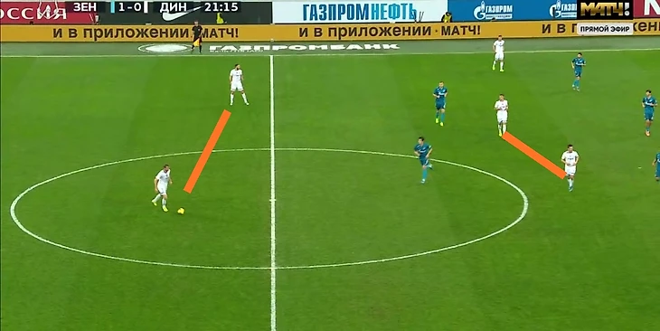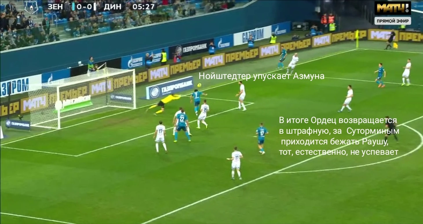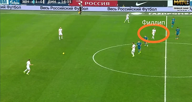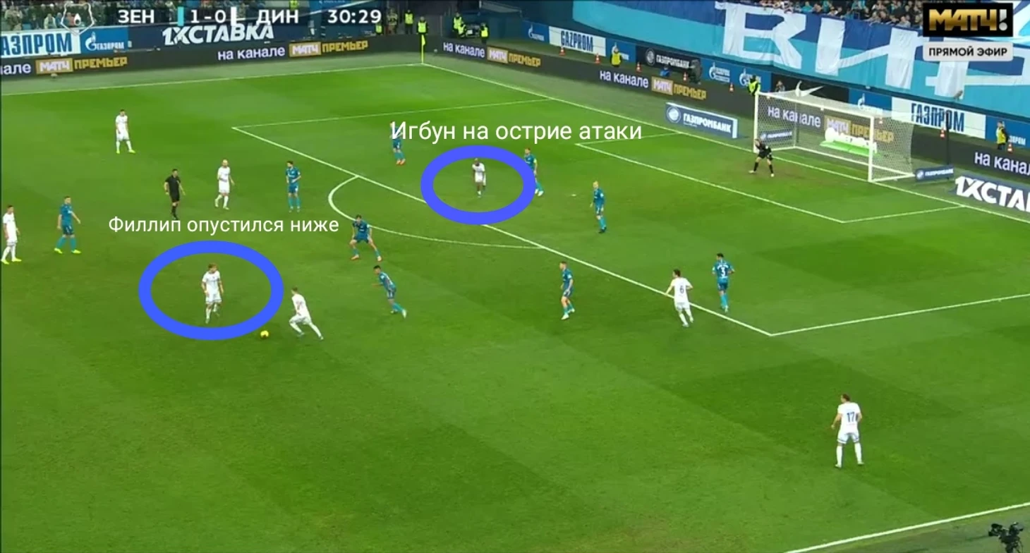Во втором тайме после замен Игбун располагался левее, Н’Жи впереди с Филлипом, те же 4-4-2. У "Зенита" были неплохие подходы,которые не удавалось завершить ударом, но и без этого у хозяев вышло 9 ударов из штрафной из 10 в общем. Можем отметить и здесь не лучшую игру "Динамо".