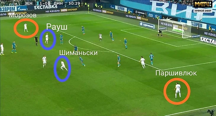 Структура оказалась уязвима к забросам на правый фланг, где был активен Караваев, из-за несогласованности действий пришел первый гол и неплохой момент.