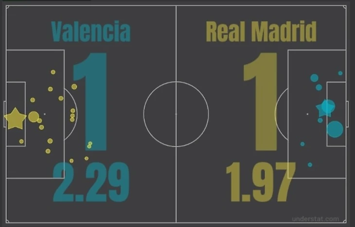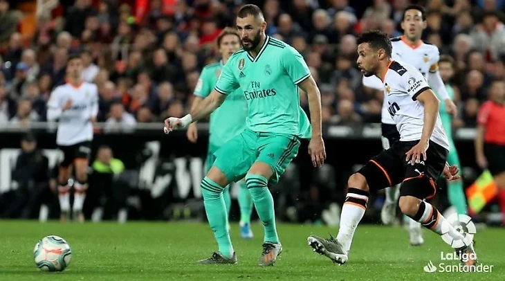 Без мяча мадридцы высоко прессинговали при розыгрыше от ворот по схеме 4-4-2, где в пару к Бензема поднимался Модрич. Но если "Валенсия" разбивала прессинг с помощью длинных передач, то появлялась острота у ворот гостей, что являлось не самым приятным моментом в этот отрезок. Но по совокупности "Реал" был лучше и, казалось, добьется положительного результата. Однако этого не случилось, хозяева отодвинули игру со своей половины и были активнее в атаке. Нужно было добавлять после перерыва, чтобы вернуться к хорошему периоду первой половины тайма.
