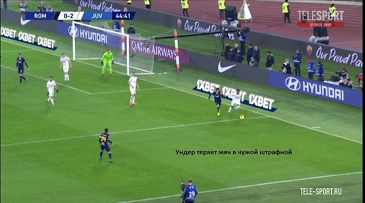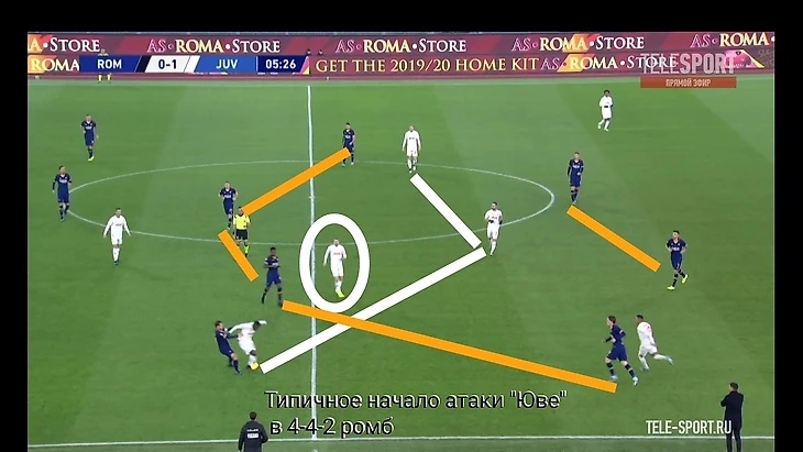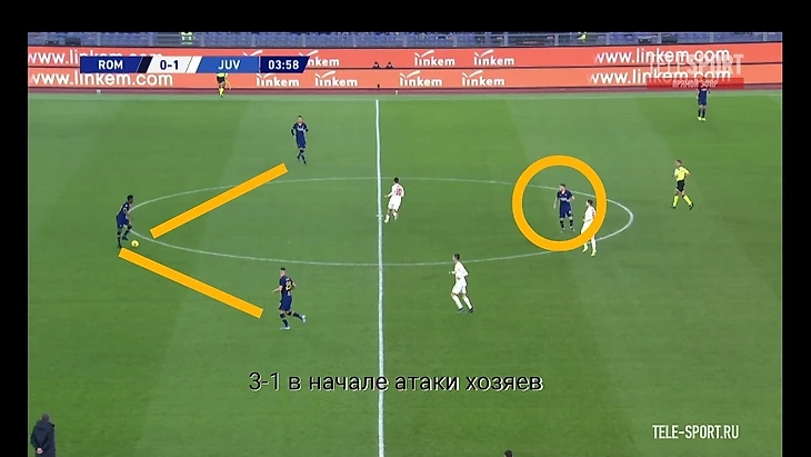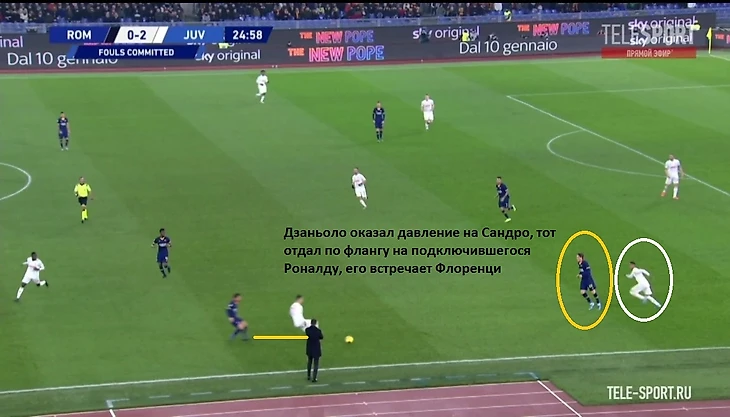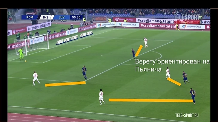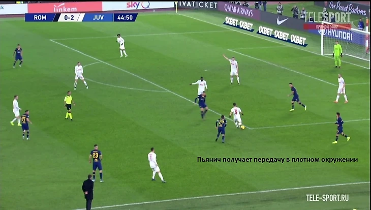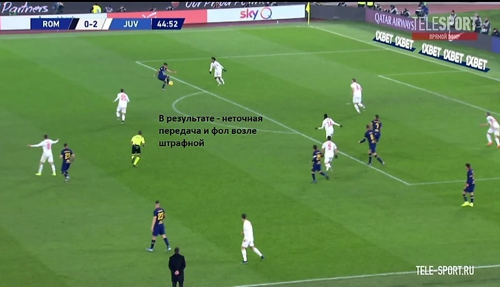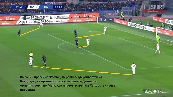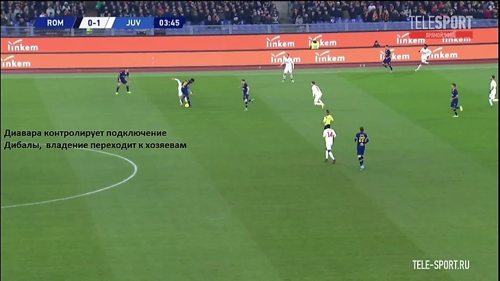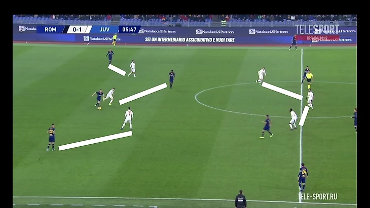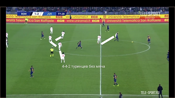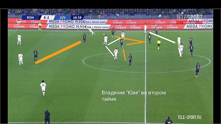 Хорошим индикатором работы римлян без мяча являлось отсутствие моментов у "Ювентуса" в позиционной атаке. После двух мячей единственный удар за тайм нанёс Роналду на 41 минуте. Гибкий ромб в центре поля должен был бить по оборонительному блоку "волков" по всем фронтам - Пьянич как организатор атак, Матюиди и Рабьо забеганиями вторым темпом и открываниями в полуфлангах, Рэмси вместе парой нападающих смещениями ниже для создания численного перевеса или проходов за счёт индивидуальных действий. Но благодаря грамотной работе хозяев мало что получалось из всего вышесказанного потенциала, атаки редко доходили до неплохих позиций. Без мяча туринцы предложили сопернику не агрессивный прессинг на границе финальной и средней трети, стараясь перекрывать тройку хозяев в начале атаки (об этом чуть позже) и компактно располагаться относительно полузащиты соперника. Понятно, что при наличии Дибалы и Роналду в составе сложно на постоянной основе использовать этот приём, таких игроков сложно загонять в рамки, но в целом , с учётом сложностей у "Ромы" в атаке, прессинг работал неплохо.