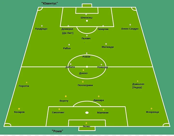 В первые десять минут хозяева прижали соперника, но извлечь из этого опасные моменты не удавалось. Без мяча структура "Ромы" видоизменилась - в прессинге теперь на Пьянича был ориентирован выдвинувшийся Верету, а Пеллегрини вместе с Джеко действовал по центральным защитникам. Затем после быстрого были созданы два моменты в одной атаке, в одном из которых был заработан пенальти. Сарри был вынужден перестроиться - вместо Дибалы и Рэмзи на поле появились Игуаин и Данило, Рабьо стал действовать выше, его место правой восьмёрки занял Куадрадо. Без мяча туринцы стали действовать 4-4-2 в среднем блоке, однако моменты у хозяев всё равно возникали - во втором тайме "Рома" действовала намного опаснее в атаке, по совокупности даже перебив "Ювентус".