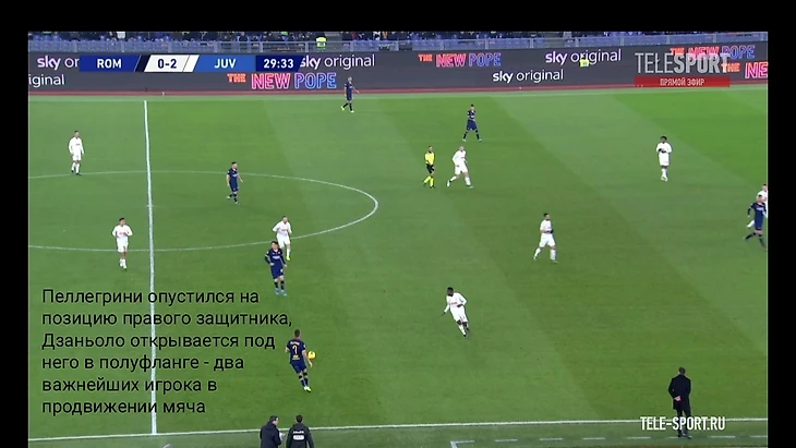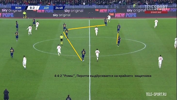 Португалец выстроил команду в 4-4-2 в среднем блоке с высоким прессингом при розыгрышах от вратаря. При высоком давлении Джеко играл по центральным защитникам, Пеллегрини ориентировался на Пьянича, крайние полузащитники выдергивались по крайним защитникам на соответствующем фланге при получении мяча, изначально действуя против восьмёрок соперника, Верету и Диавара страховали, контролируя подключения Рэмзи или кого-то из группы нападения гостей. При оборонительных действиях в средней трети уже садились в 4-4-2, Пеллегрини не всегда ориентировался по боснийцу, ему давали принимать мяч, главное - создать плотность дальше. Перотти и Дзаньоло (а затем Ундер) выдёргивались на крайних защитников соперника, которые при позиционном владении располагались низко, и если пас шёл по флангу, то принимающего уже встречал крайний защитник. Стоит отметить и контрпрессинг римлян - после потери моментально вступали в отбор и в некоторых ситуациях смогли вернуть мяч (как на 45 минуте, заработан штрафной из неплохой позиции).