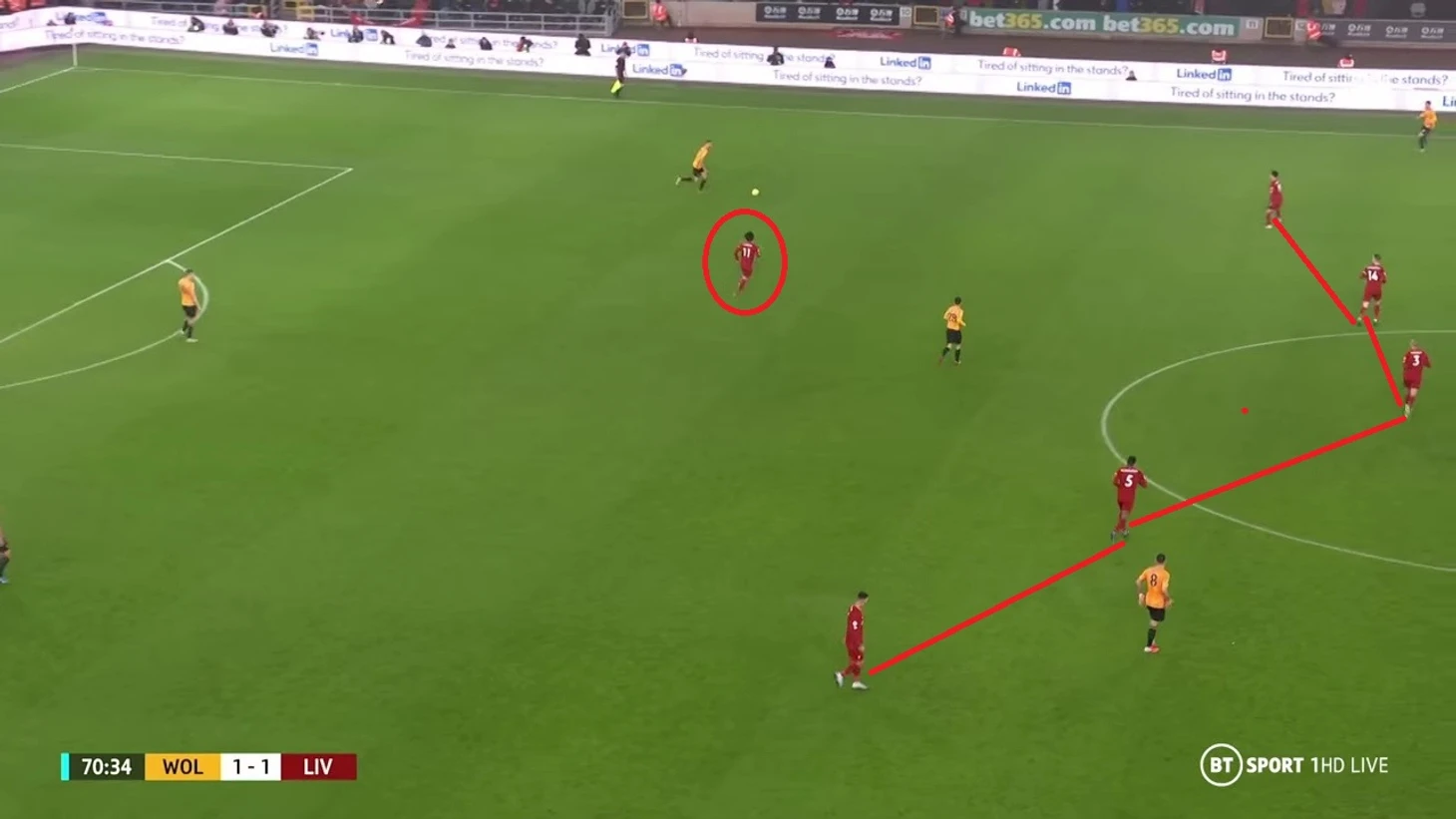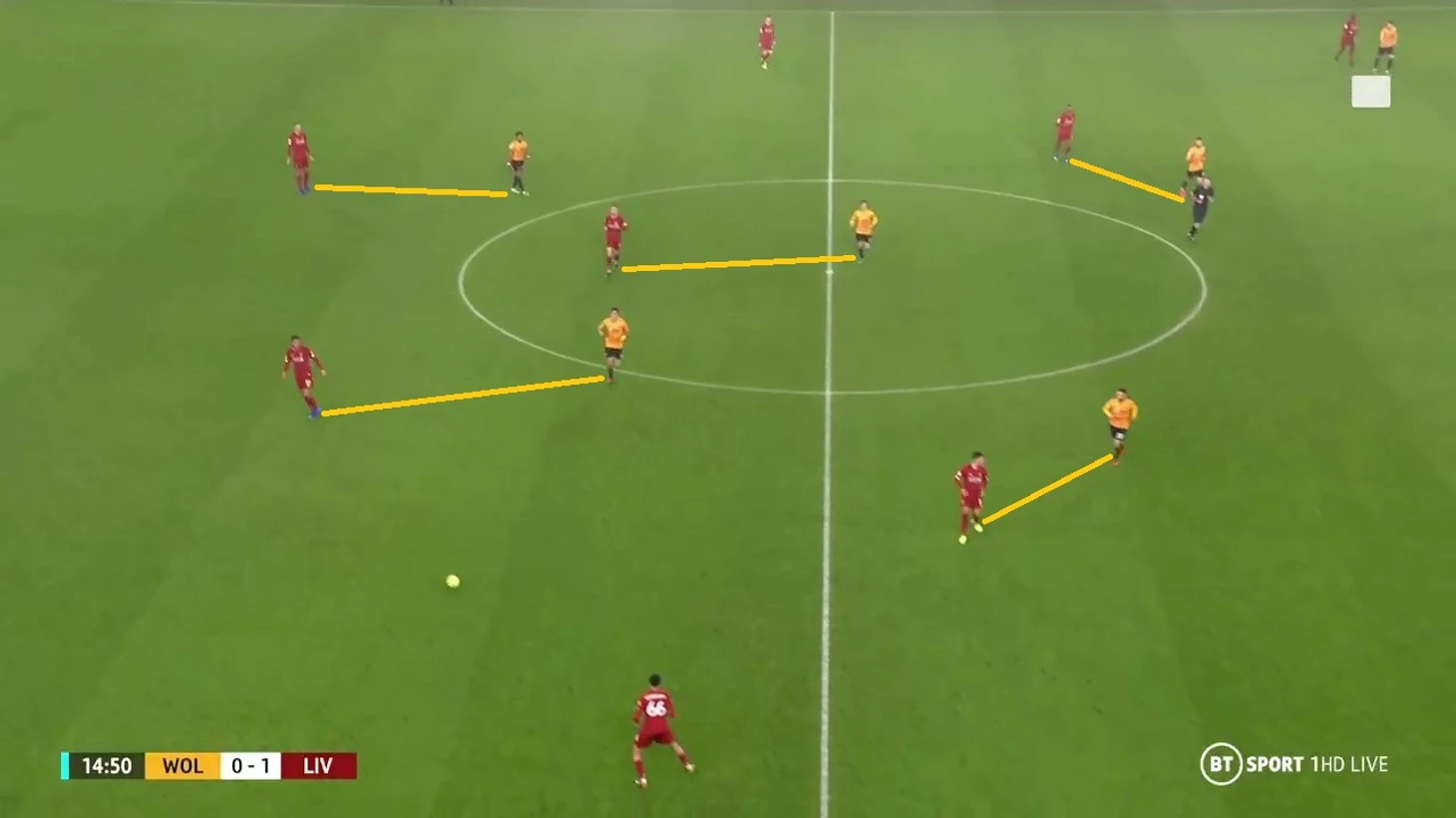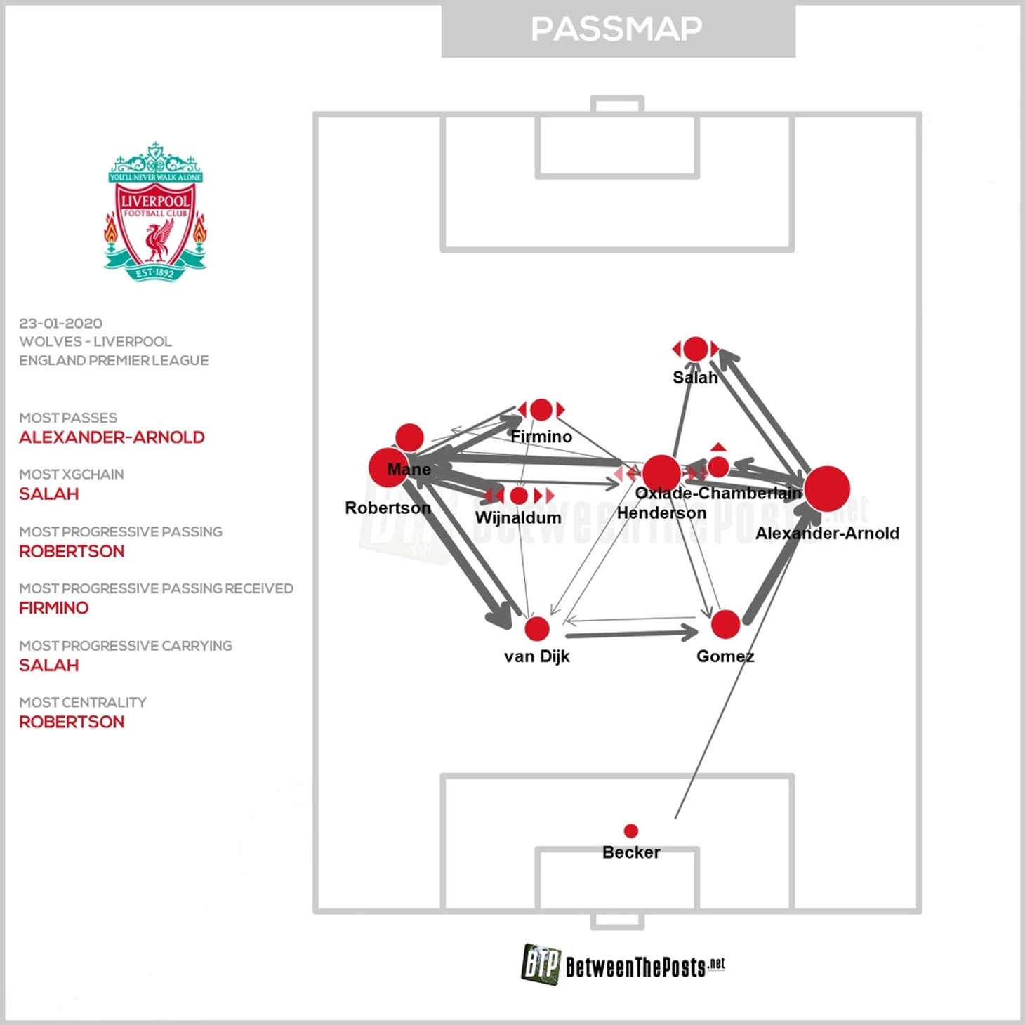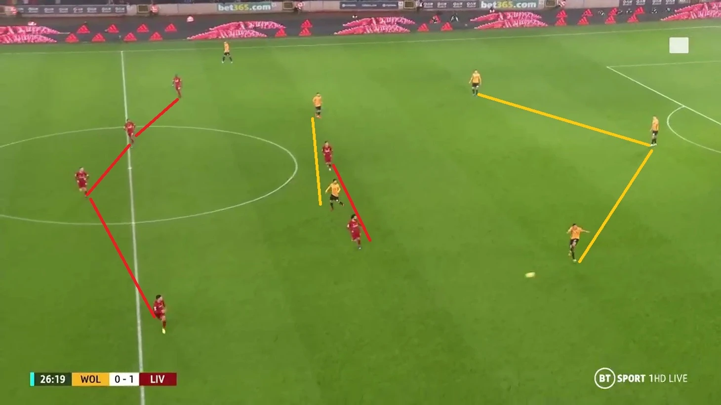 Без мяча хозяева встречали соперника по схеме 5-2-1-2, где нападающие встречали центральных защитников, располагавшийся над ними Нету действовал по Хендерсону, центральные полузащитники ориентировались по восьмёркам соперника. Если первую линию отыгрывали "Вулверхэмптон" садился ниже в рамках этой же схемы. Привязка к игрокам, озвученная выше, соблюдалась в зависимости от ситуации, но в основном именно так сдерживали атаку "красных". Однако не стоит забывать о крайних защитниках "Ливерпуля", которые играют важную роль в продвижении мяча и создании моментов. Как ни странно им была предоставлена определённая свобода, латерали не встречали их при получении мяча, это делали уже центральные полузащитники, закрывая линии передач на опекаемых восьмёрок. На карте передач видно огромное влияние крайних защитников при владении, однако это не приводило к весомым последствиям. Структура хозяев неплохо работала, сдерживая позиционную атаку лидеров чемпионата. По сути, кроме смещений Фирмино в центр поля, благодаря которым восьмёрки получали свободу, "Ливерпуль" мало что предложил для вскрытия оборонительного блока. К проблемам добавилось и повреждение Мане, важнейшего игрока в атаке, вместо которого появился новичок Минамино, занявший его место на фланге.