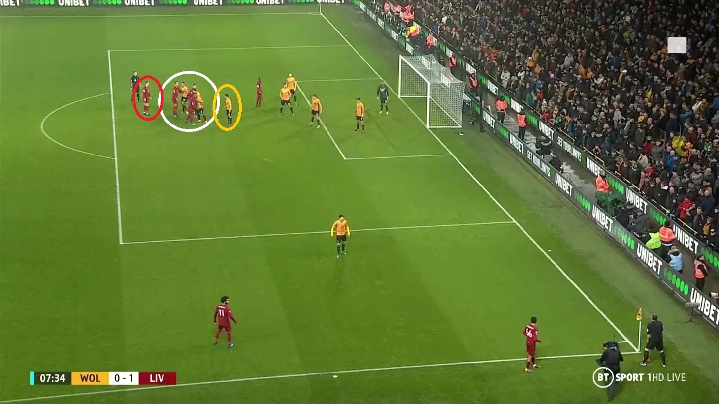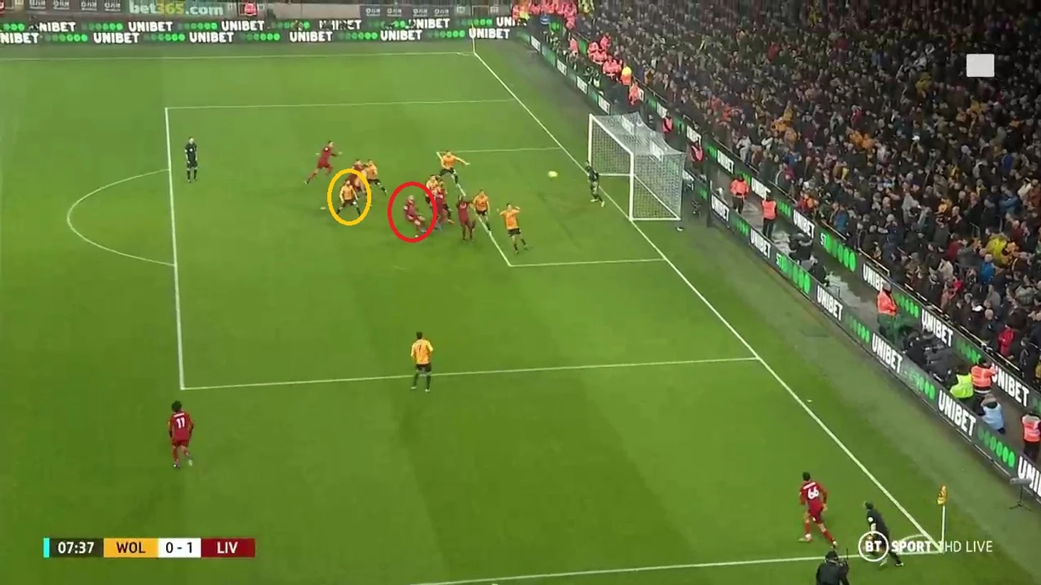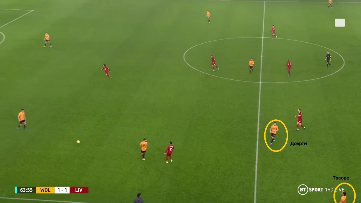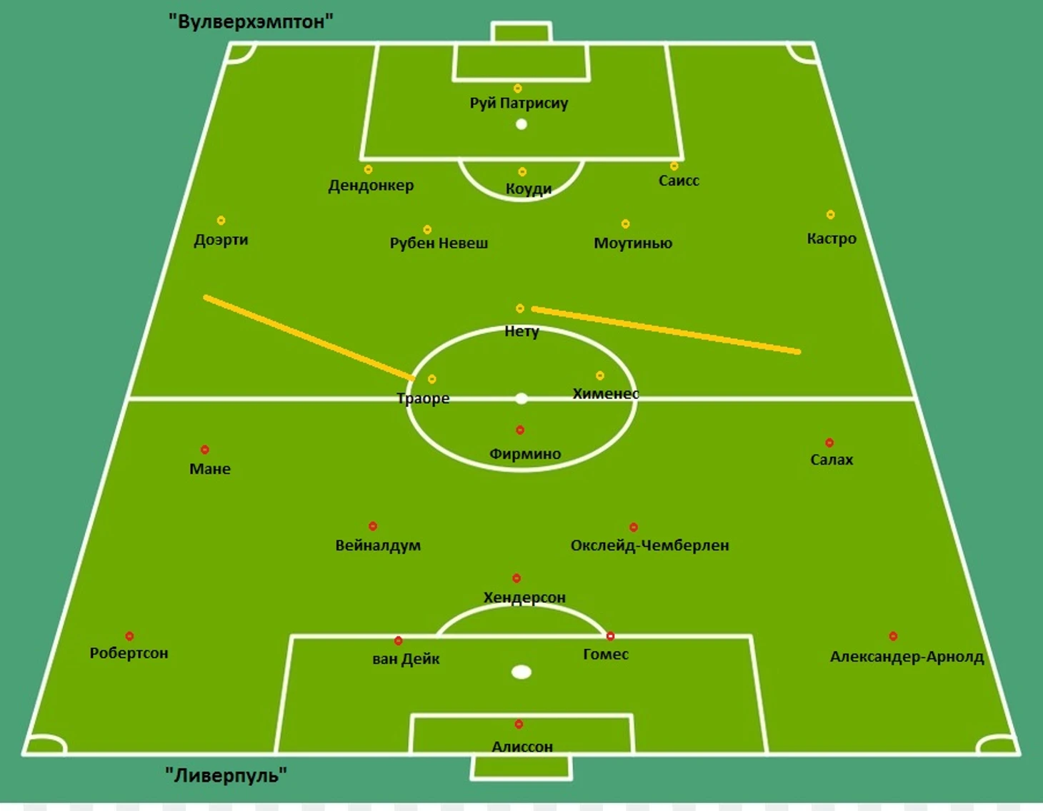 При контроле мяча в пером тайме "волки" испытали больше трудностей. Расставляясь в начале атаки по схеме 3-2, упор делался на доводку мяча до нападающих через латералей или прямых забросов от центральных защитников или действовавших над ними Невеша и Моутиньо. Адама Траоре искал мяч правее, а Нету часто смещался налево, тем самым, схема напоминала 3-4-3. Аналогичные проблемы "Вулверхэмтона" в атаке (сложности с созданием моментов) происходили уже из-за грамотной структуры гостей без мяча. Клопп решил не использовать высокий прессинг, в основном команда находилась в среднем блоке по схеме 4-4-2 с Салахом и Фирмино впереди (11.46 PPDA в этом матче при 8.86 в среднем по сезону). Можно сказать, что в первой половине встречи команды лучше сыграли без мяча, контролируя атаку соперника, чем с ним, развивая своё владение.