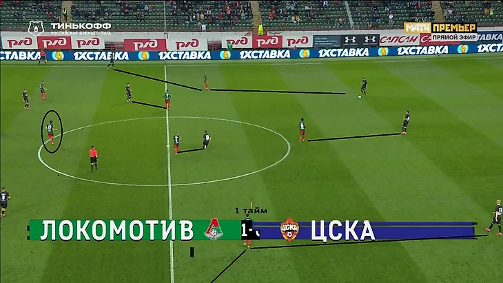 В начале игры при розыгрыше соперника от ворот «Локомотив» встречал 1-в-1, и Акинфеев вынужден был выбивать мяч вперед, но типичной такую ситуацию не назовёшь (тем более после первого забитого мяча). Хозяева в основном встречали владение «ЦСКА» в средней трети и ориентировались по схеме «армейцев». В привычной 3-4-2-1 у «ЦСКА» Эдер периодически оказывал давление на Дивеева, Мариу и Миранчук находились в полупозиции между латералем и крайним центральным защитником, но не встречали их активно. Баринов и Крыховяк ориентировались по Облякову и Марадишвили, а ниже Магкеев страховал оборонительную структуру (и если кто-то из нападающих «ЦСКА» приходил в его зону, то он играл по нему). Но у гостей было довольно гибкое построение, периодически изменяющееся на 3-5-2 благодаря смещениям ниже одного из крайних нападающих. В таком случае задачи Мариу и Миранчука не сильно менялись, но Эдеру приходилось помимо Дивеева учитывать находившегося за спиной Облякова. Баринов и Крыховяк встречали Марадишвили и одного из крайних нападающих (чаще Влашича) в своём полуфланге, а Магкеев ориентировался по Дзагоеву или Чалову в его зоне.