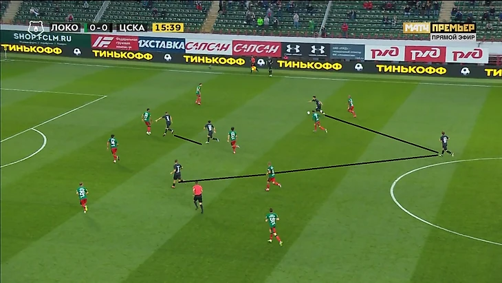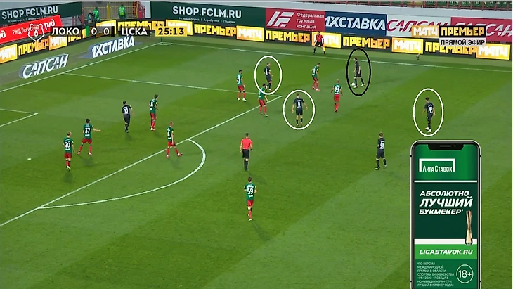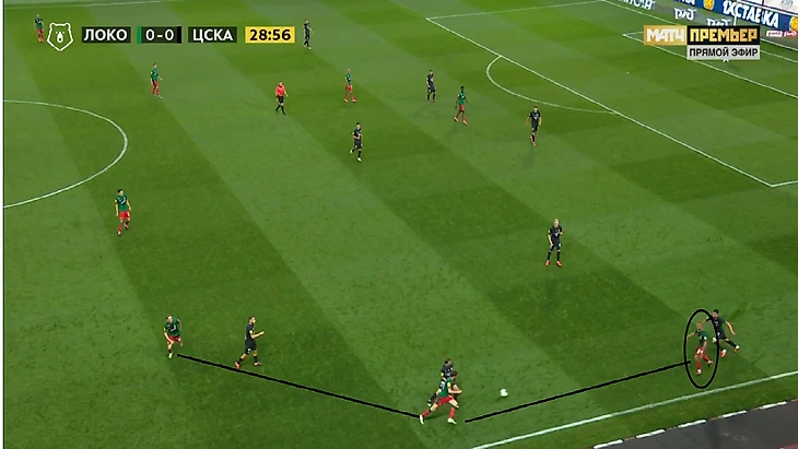 Отдельно стоит выделить влияние латералей на атаку «ЦСКА». Марио Фернандес и Щенников исполняли разные роли при владении, но все они были связаны с игрой в финальной трети. Марио на правом фланге открывался под переводы слева или пас по флангу и через розыгрыши старался выйти на пространство для подачи или прострела, а также сам выводил партнёров на удобную позицию для их исполнения. На фланге Фернандеса часто разыгрывались треугольники и туда смещалась внушительная группа игроков, при этом роль Щенникова во многом зависела от взаимодействия справа. Оборонительная структура «Локомотива» смещалась левее из-за скопления игроков соперника, Игнатьев также играл узко и часто при навесах или прострелах ориентировался по мячу. Этим пользовался Щенников, открывавшийся у него спиной под забросы. В первом тайме было 2 момента с подключением Георгия за спину правому защитнику хозяев, но они не закончились моментами. Всё это позволяет говорить о важности латералей в позиционке «армейцев».