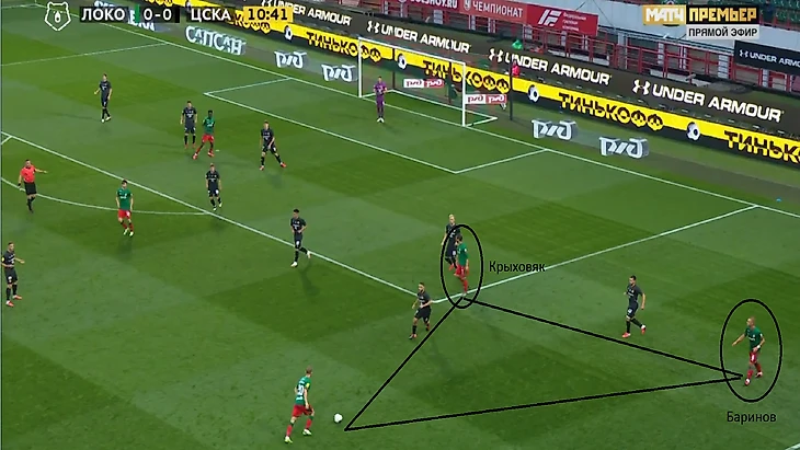 Первый пенальти был заработан как раз в результате смещения Баринова на фланг - Миранчук после паса Игнатьева отдал вперёд по бровке, Дмитрий отыграл Щенникова благодаря умному движению, и после прохода Алексея и его паса в штрафную Эдер получил по ногам от Дивеева. Действия восьмёрок «Локомотива» в этом матче при владении играли ключевую роль.