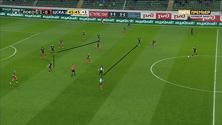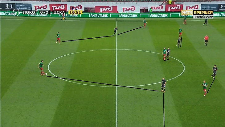 Атакующая группа при контроле в центре поля располагалась узко, Мариу и Миранчук, если не были задействованы во фланговых взаимодействиях, находились в полуфланге перед штрафной. Алексей также часто смещался в центр для создания численного преимущества. Это важно, потому что «ЦСКА» без мяча в средней трети жертвовал свободой Чорлуки и Мурило ради перекрытия центра поля «Локомотива» - нападающий ориентировался по Магкееву, Марадишвили и Обляков встречали Крыховяка и Баринова, а крайние нападающие находились в полупозиции между центральным и крайним защитником на своём фланге. Открывания Миранчука могли помочь в продвижении мяча, но он не смог ими воспользоваться в полной мере.