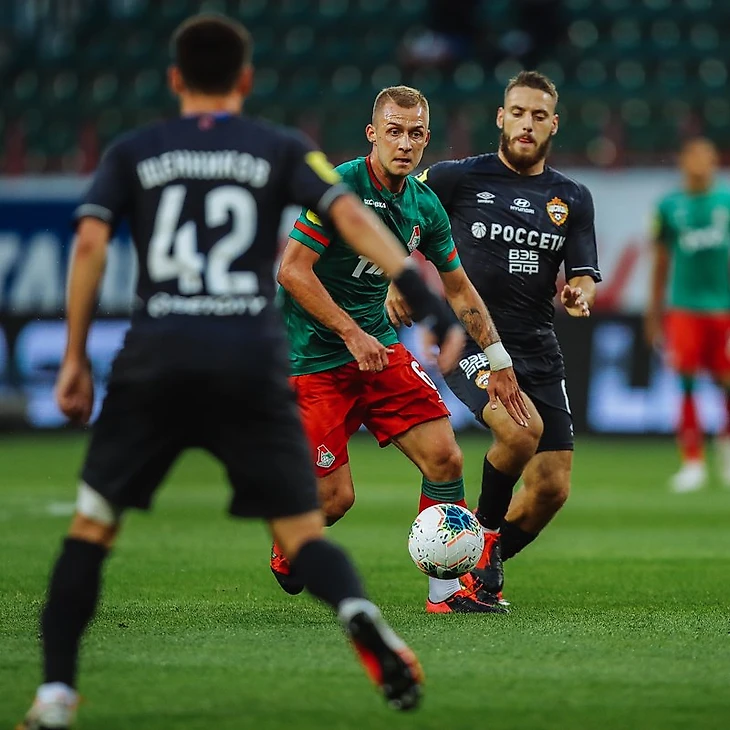 При разговоре об игре «Локомотива» в защите нужно затронуть и действия «ЦСКА» в атаке. Я уже говорил о гибкой структуре «армейцев» - основная схема 3-4-2-1, с Обляковым и Марадишвили в центре над защитниками и группой атаки, располагавшейся узко перед штрафной, могла превратиться в 3-5-2 с Влашичем и Марадишвили в роли восьмёрок и вариативной ролью Дзагоева (из-за его движения можно описать схему как 3-5-1-1). Всё это хорошо тем, что хозяевам приходилось периодически перестраиваться и ориентироваться по текущей расстановке соперника. Также подобная вариативность только поощряет индивидуальные действия креативных игроков - Влашич и Дзагоев могли перемещаться по всей финальной трети, отходить ниже для помощи в продвижении мяча и искать свободное пространство, задействуя дриблинг или помогая партнёрам найти более выгодную позицию.