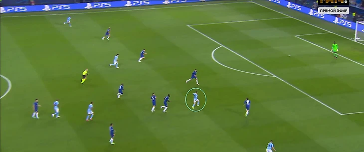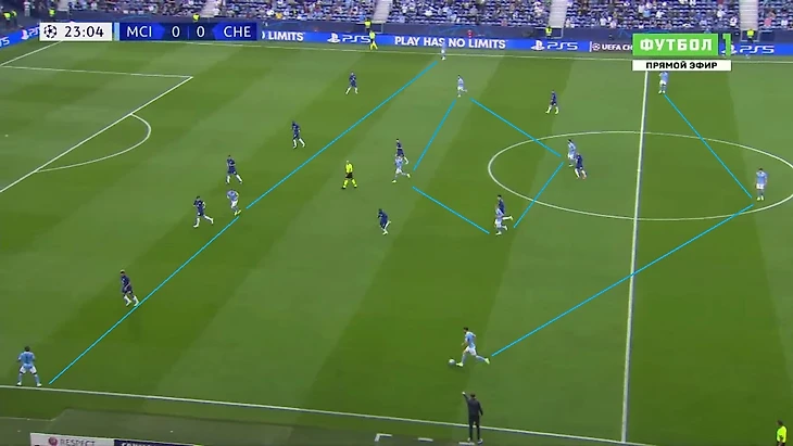 Тройка защитников в начале атаки помогала создать численное равенство против нападающих «Челси». Ромб в полузащите мог как поддерживать игру на флангах (смещения Зинченко и Бернарду Силвы), так и атаки через центр (Фоден и де Брюйне грамотным движением могли создавать пространство перед штрафной).