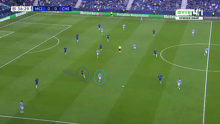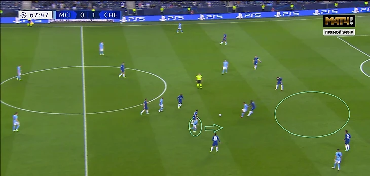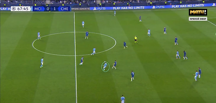 При этом как только «Манчестер Сити» перешёл на схему 4-3-3, то им удалось использовать выдвижение Рюдигера. На 68-й минуте Фоден отдал на Фернандиньо и сразу рванул вперёд - Жезус выдернул немца из линии и в касание отдал на Фила, вбегавшего в свободную зону. После этого момента Аспиликуэта и Рюдигер стали чаще оставаться на своих позициях.