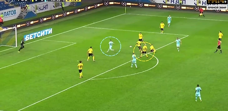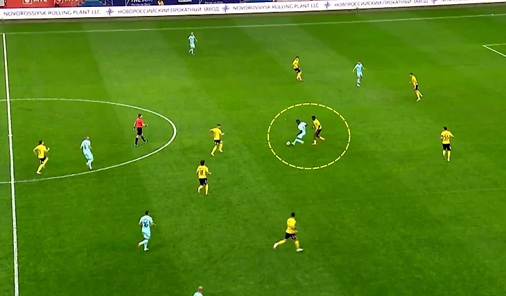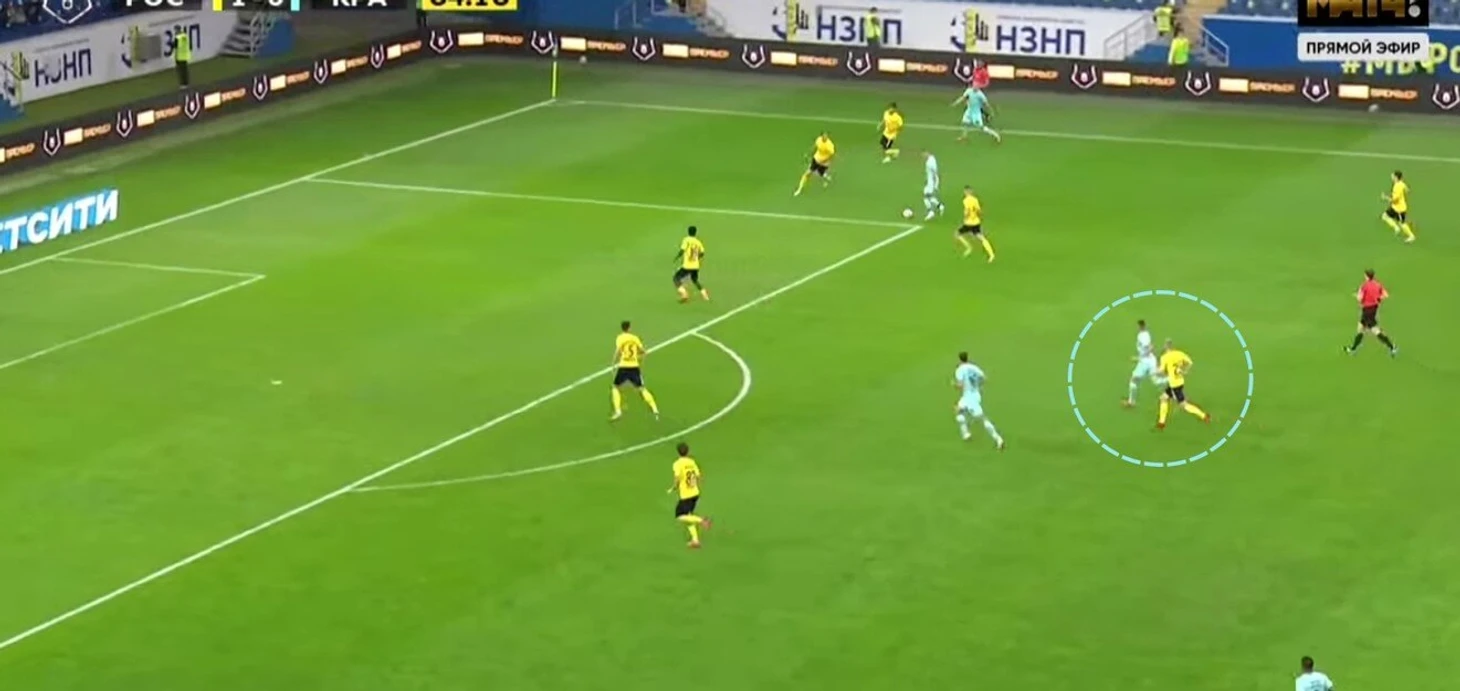 При ставке на плотную и компактную игру без мяча логично, что Сёмин в атаке полагался на подбор длинных передач. Песьяков и центральные защитники отправляли мяч в насыщенную зону в борьбу на Комличенко или Альмквиста, где за отскок цеплялись два или три игрока. И хоть гол пришёл не в результате реализации идеи, она помогала как можно быстрее доставить мяч в высокую позицию и закрепиться на чужой половине.
