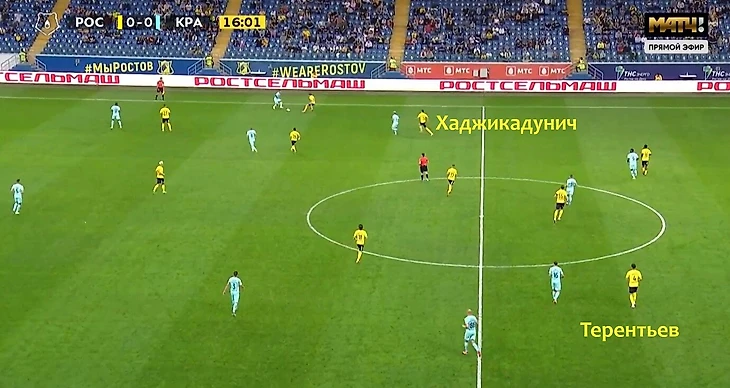 «Ростов» использовал схему 5-3-2 при обороне в среднем блоке. Если мяч доходил до крайнего защитника «Краснодара», то хозяева часто включались в прессинг. На Рамиреса или Корнюшина выдвигался вингбек, а его партнёры перекрывали ближние варианты для паса. Чаще всего «Ростов» давил справа в зоне Рамиреса. Когда Лангович встречал колумбийца на приёме, Терентьев на противоположном фланге смещался ближе к центральным защитникам и формировал четвёрку в последней линии. Если Классон и Кабелла пытались забежать за спину правому вингбеку «Ростова», то его страховал Хаджикадунич.