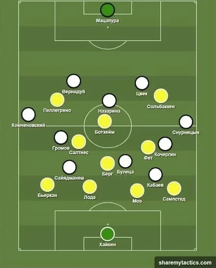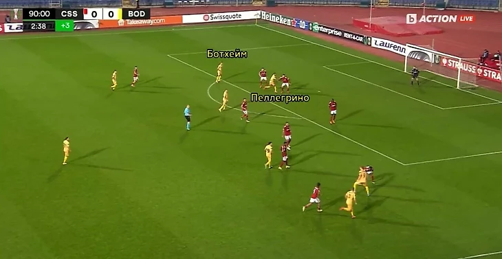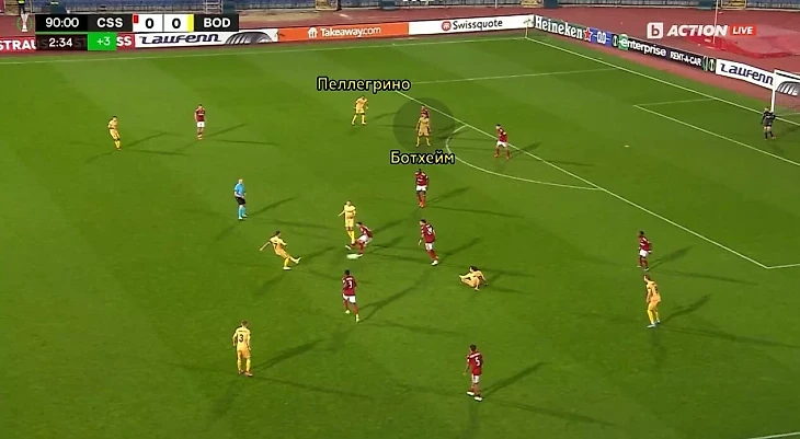 «Будё-Глимт» нельзя назвать прессингующей командой так как чаще всего Кьетиль Кнутсен опирался на оборону в среднем блоке с периодическими выдвижениями в давление. Структура могла варьироваться – помимо привычной схемы 4-5-1 использовалась узкая расстановка 4-3-3 или 4-3-1-2 за счет высоких позиций крайних нападающих. Ботхейм обычно располагался на острие и перекрывал свою зону в центральном круге, по ситуации встречая опорника. Но иногда он получал персональные установки под конкретного соперника. В игре с «Зарёй» «Будё-Глимт» отзеркалил схему соперника и использовал формацию 4-3-1-2. Так было удобнее встречать 1v1 в центре поля: Пеллегрино и Сольбаккен напрягали центральных защитников, Ботхейм ориентировался по опорнику Назарине, Салтнес и Фет встречали восьмерок Кочергина и Громова, а Берг следил за «десяткой» Булецей.