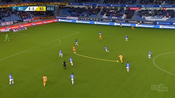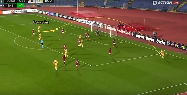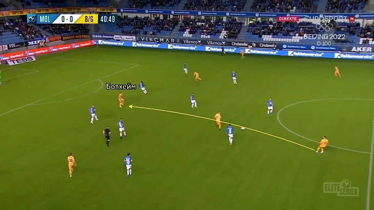 Когда передача на него все-таки проходит, норвежец не затягивает с решением и старается в одно-два касания найти партнера чуть ниже или ближе к флангам. Оппоненты вынуждены разворачиваться к Ботхейму, а полузащитники «Будё-Глимт» уже находятся лицом к нему и имеют лишние секунды для принятия дальнейшего решения после ответного паса. Так Эрик, по сути действуя как таргетмен, помогал команде закрепить владение в финальной трети за короткое время.