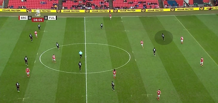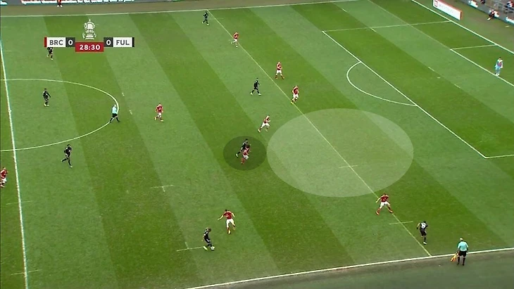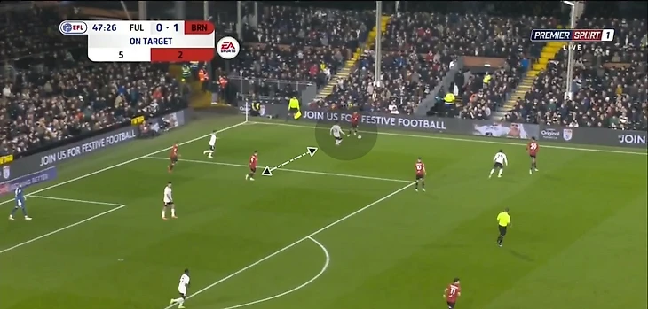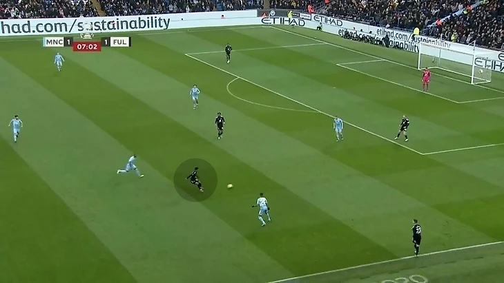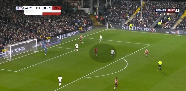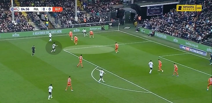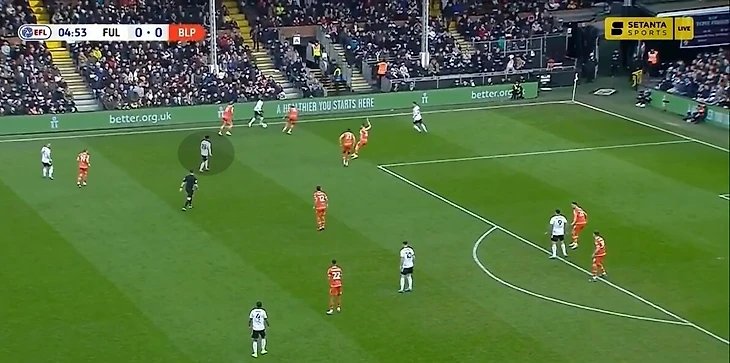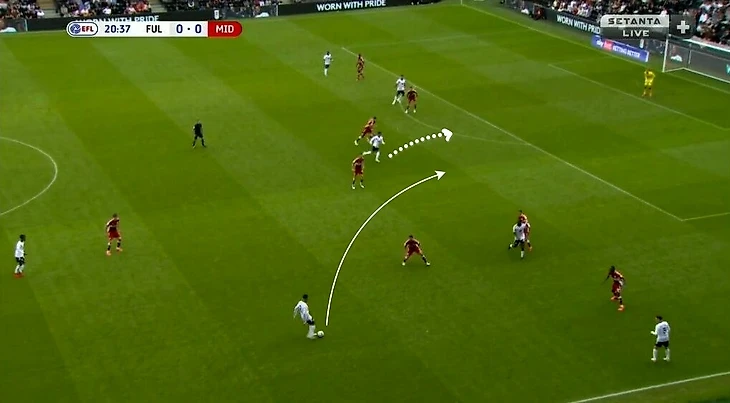 Главное качество Карвальо при владении – поиск свободных зон в финальной трети. Он подстраивается под движение партнеров, мгновенно сканирует ситуацию и совершает рывок в нужный момент. Фабио грамотно пользуется расположением соперников, связанных опекой, или вовремя видит большое расстояние между защитниками в последней линии. Взаимодействие происходит не только с Митровичем. «Фулхэм» старается при владении создавать ситуации, когда соперника связывает фланговый игрок или центральный полузащитник. В такой среде сильные стороны Карвальо раскрываются наиболее ярко. Например, в игре с «Мидлсбро» в позиционной атаке «Фулхэма» хавбек Онома связал центрального защитника, пока чужой опорник рядом с ним следил за мячом. Карвальо заметил свободную зону и открылся под передачу – он смог принять мяч и прострелить в штрафную (по нему доиграл полузащитник «Мидлсбро»).