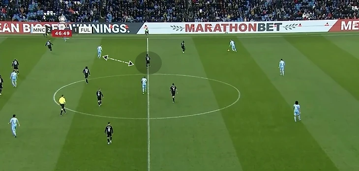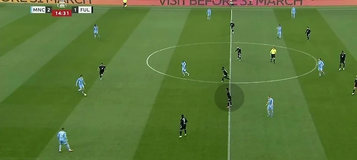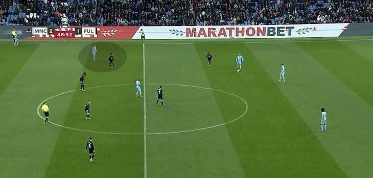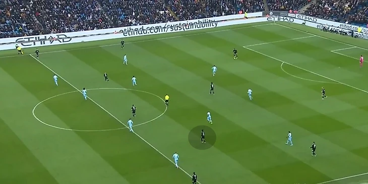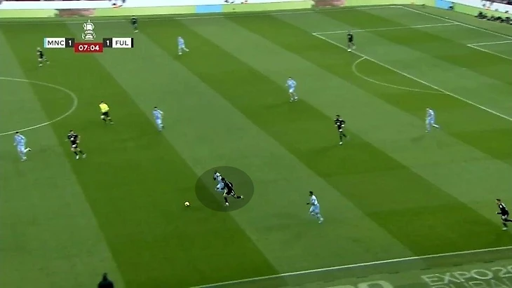 Но структура может меняться в зависимости от соперника. Против «Манчестер Сити» в проигранном матче Кубке Англии Карвальо получил сразу несколько оборонительных задач. В нужной ситуации он опускался ниже и участвовал в формировании блока в структуре 4-1-4-1 (4-5-1) для создания большей плотности в центре на своей половине.