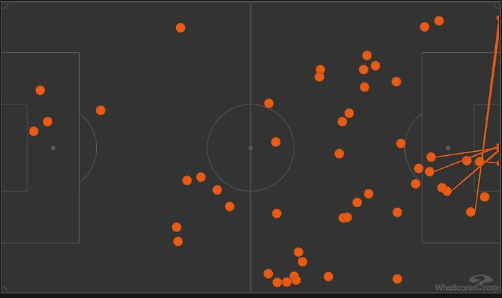 Чаще всего он встречается с мячом как раз в штрафной. С лета 2017 года (тогда стала доступна статистика) в Бундеслиге и в Ла Лиге у него 21% действий внутри штрафной. Вот как выглядят его цифры относительно других топ-форвардов:
