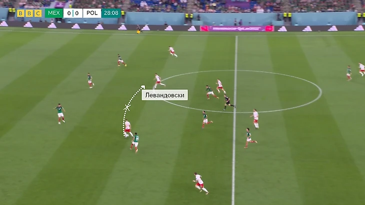 В таких условиях Левандовски вынужден ситуативно смещаться ниже и помогать продвигать мяч. Так Польша получает дополнительный вариант для паса или имеет шанс выйти из-под давления.