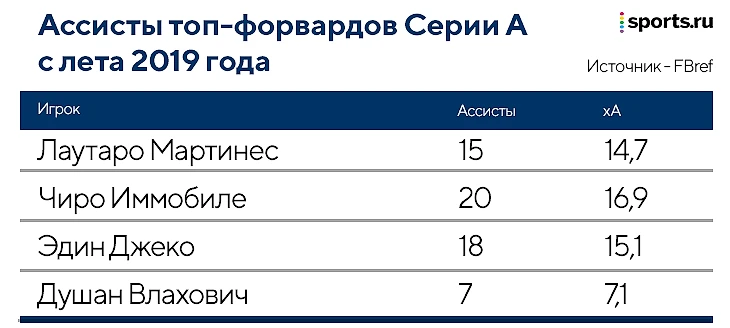 Многое зависит и от партнеров. По ожидаемым цифрам Мартинес на одном уровне с Иммобиле и Джеко, но его передачами распорядись хуже.