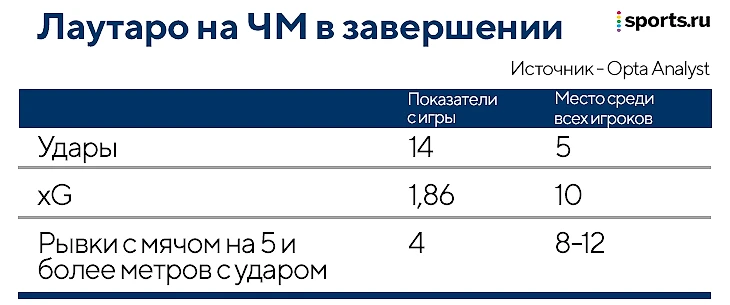 Перед ЧМ Лаутаро считался основным форвардом сборной, но после выходов в старте против Саудовской Аравии и Мексики не появлялся на поле раньше 71-й минуты. Это не помешало Мартинесу оказаться в топ-10 по ударам с игры, xG и попыткам пробить после рывков с мячом.