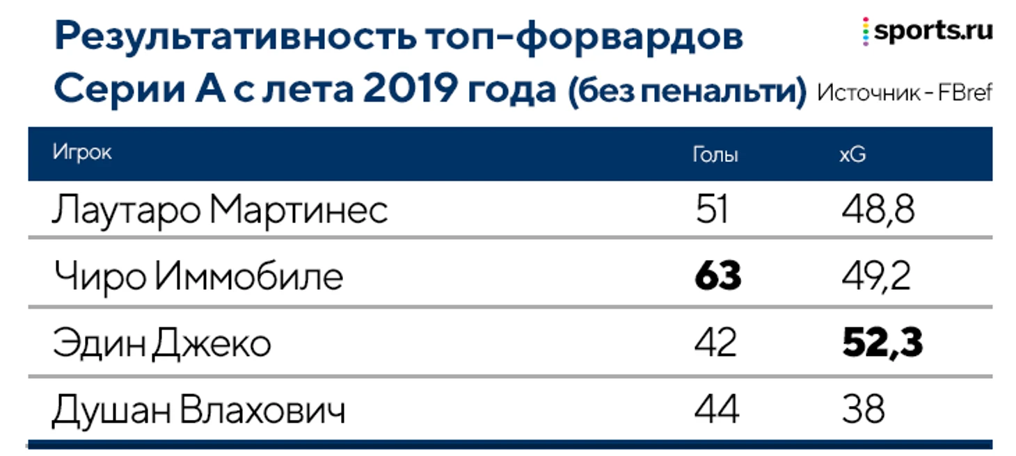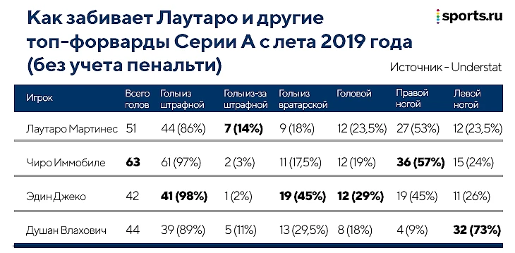 Аргентинец стал играть регулярно с лета-2019 – в Серии А с того момента он забил 51 мяч (без учета пенальти) с 48,8 xG. Лаутаро вместе с Иммобиле и Влаховичем преодолел отметку в 40 голов и одновременно реализовал больше, чем ожидалось по цифрам.