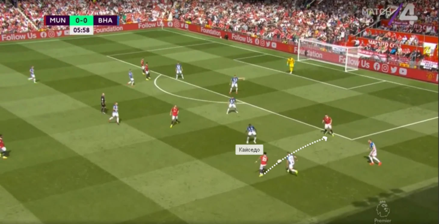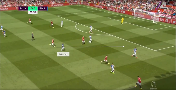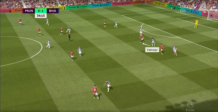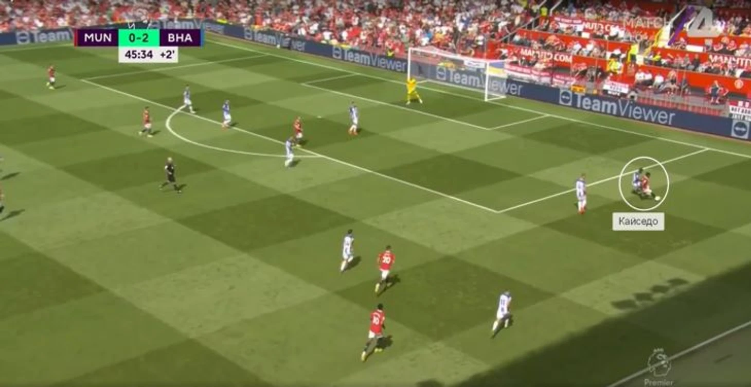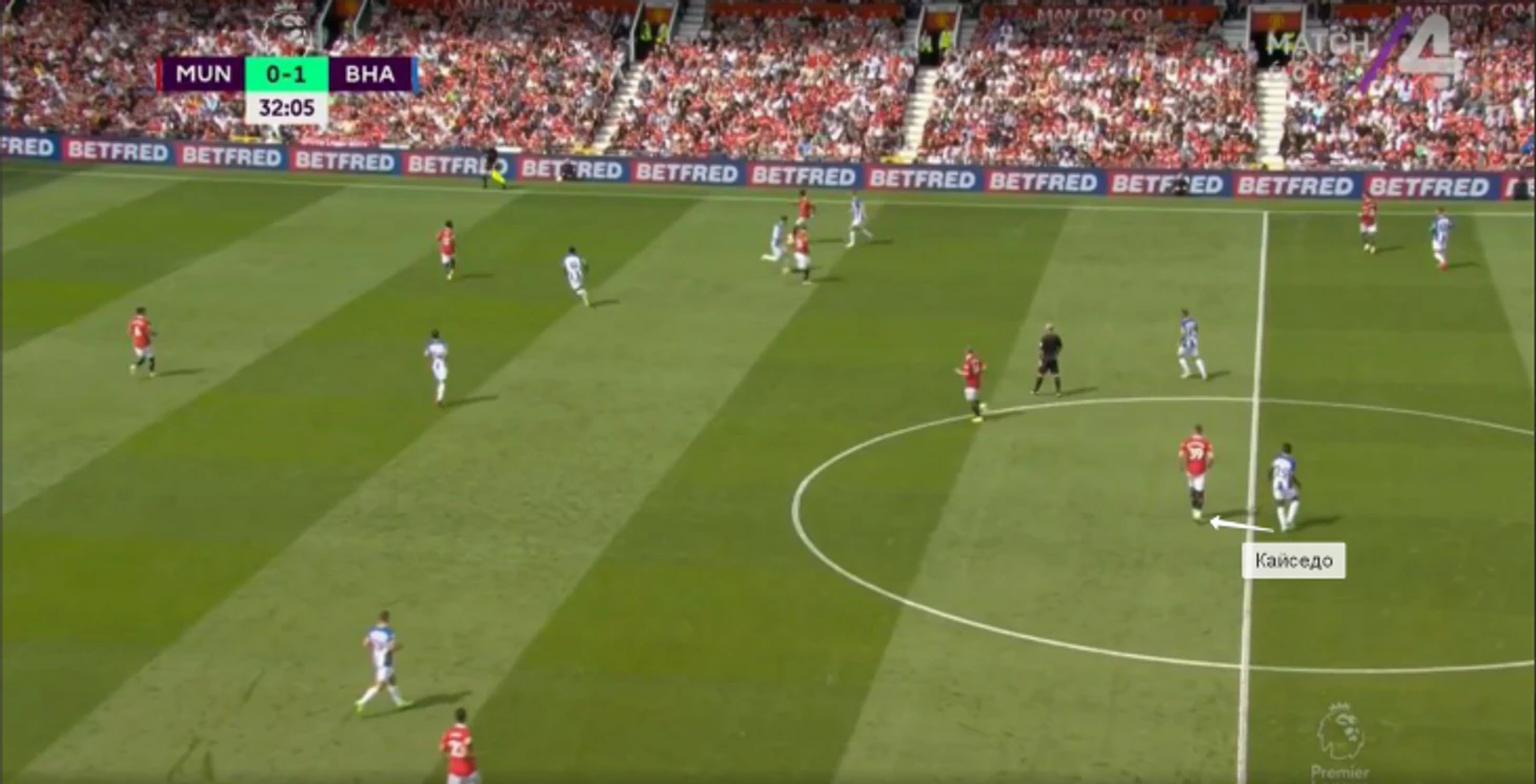Против «МЮ» Кайседо ориентировался по Мактомини. Ниже типичные эпизоды: сначала Мойсес находится рядом в центре поля во время прессинга «Брайтона».