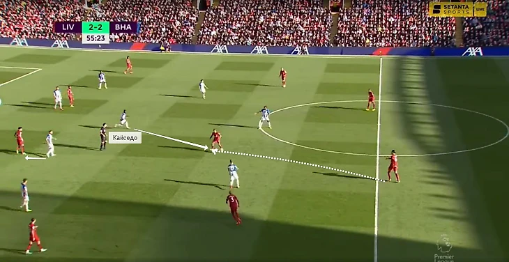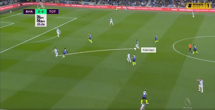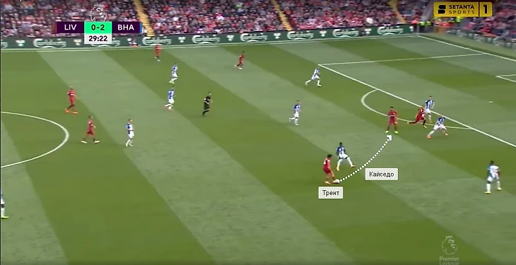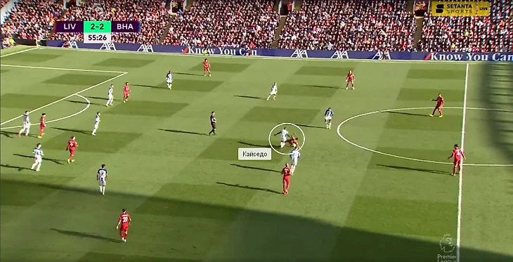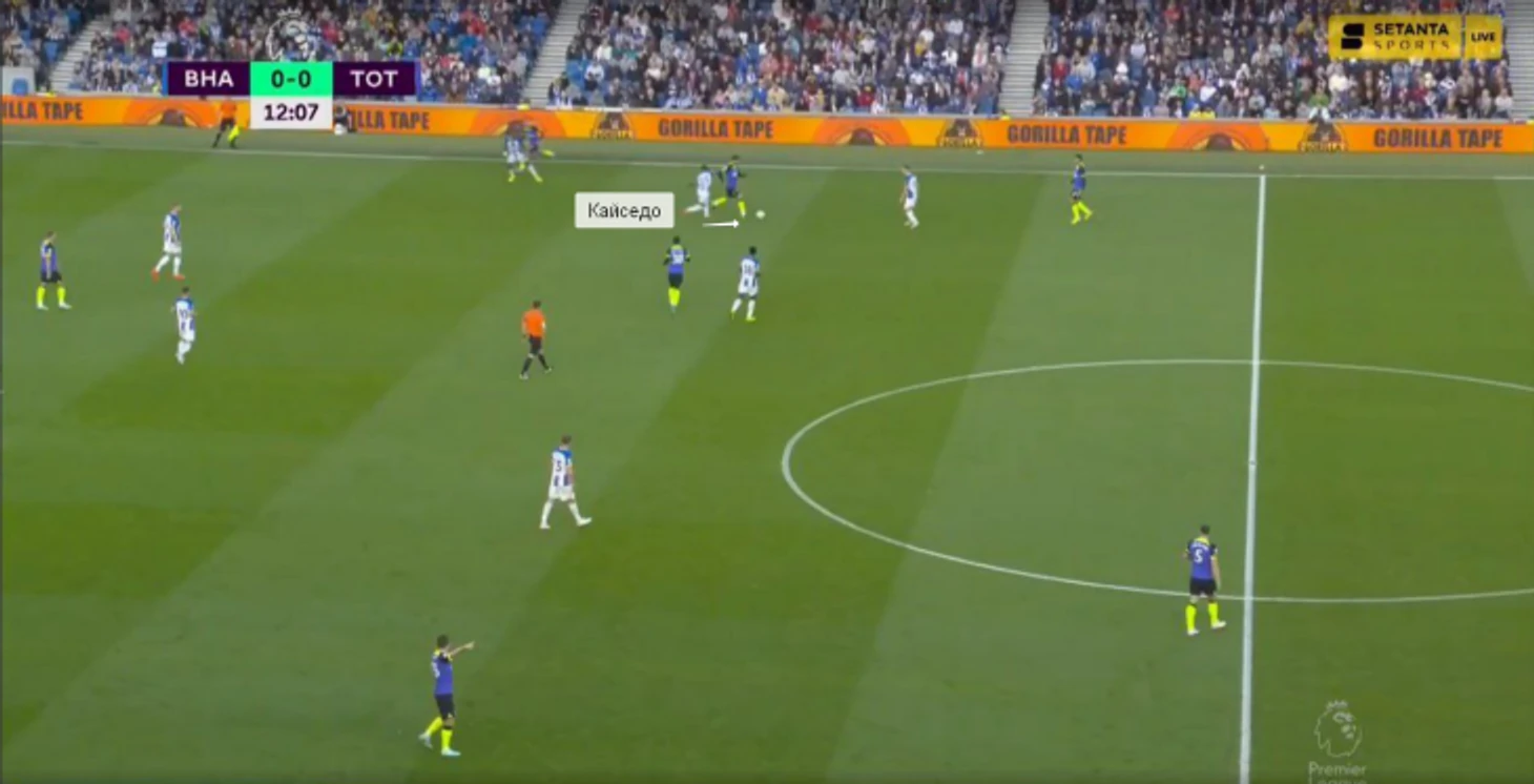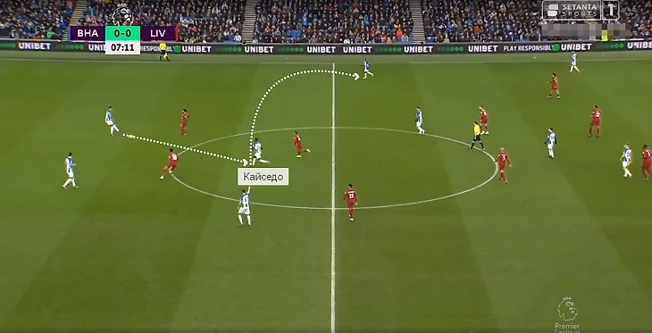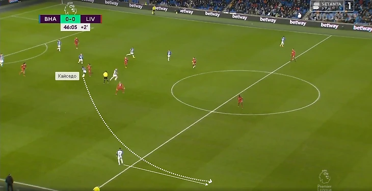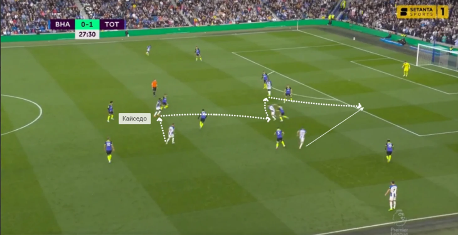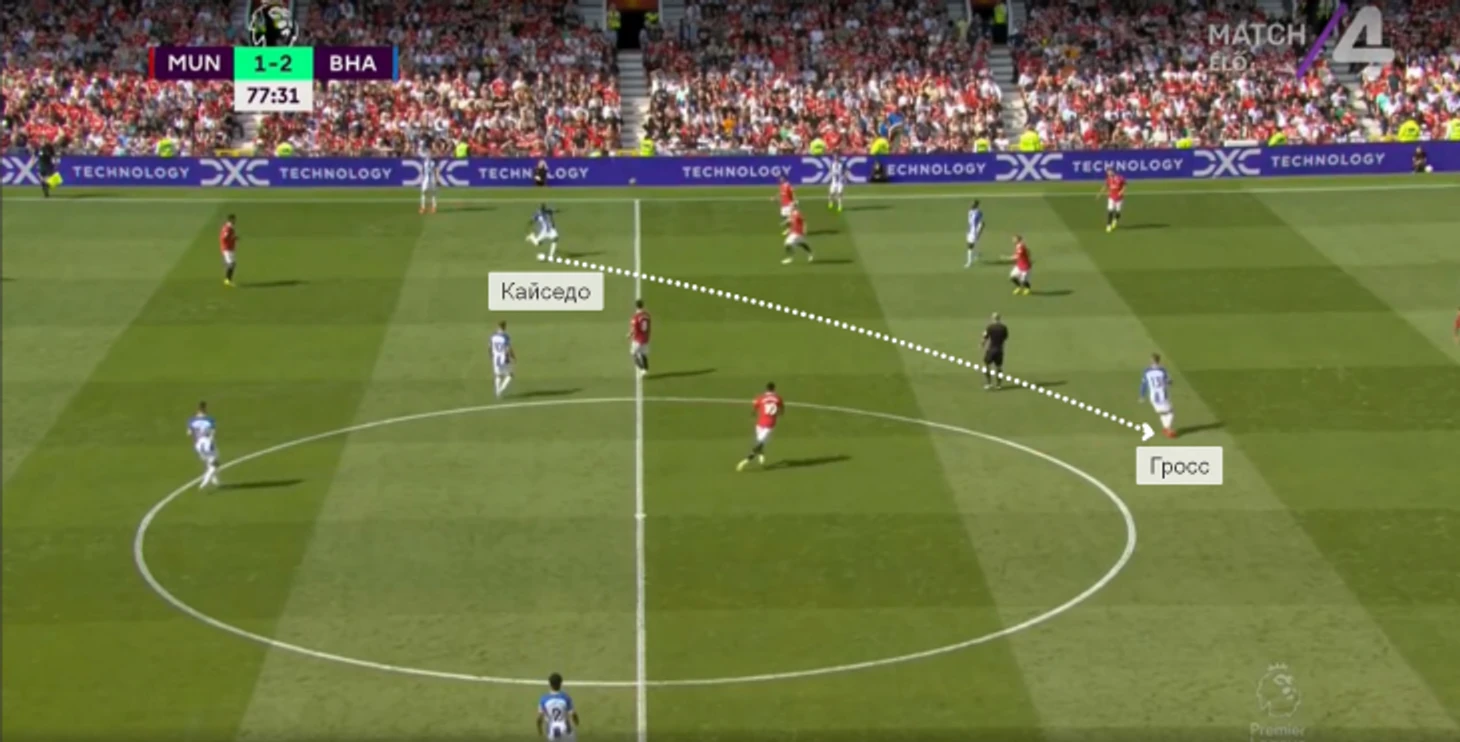 В игре с «Тоттенхэмом» Кайседо в касание сделал передачу на Троссарда и задал темп перспективной атаке. Бельгиец вытянул за собой Дэвиса, а ему за спину начал рывок Гросс – через Уэлбека «Брайтон» довел мяч до него (но неудачное последующее решение испортило розыгрыш).
