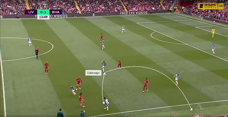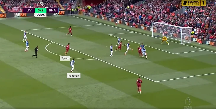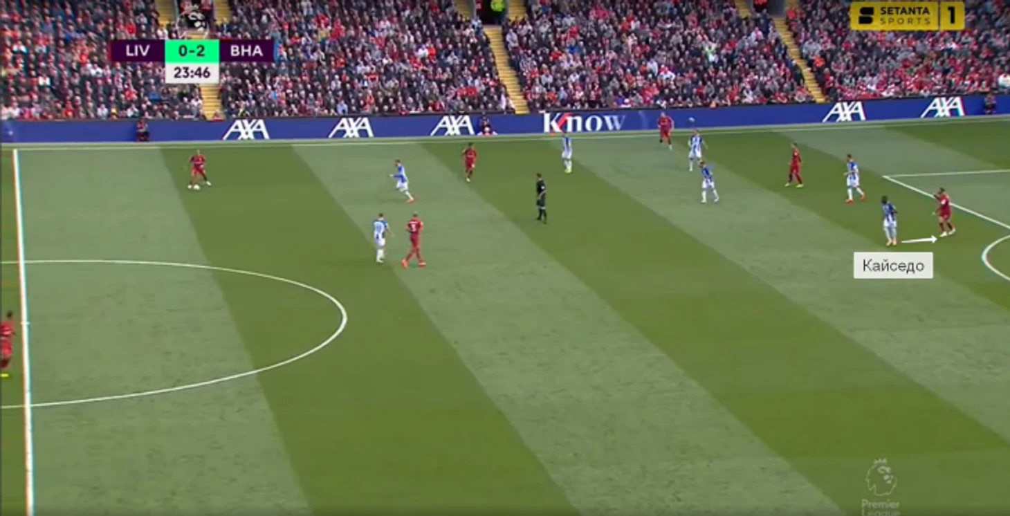 Кайседо остался на месте, хотя правый защитник «Ливерпуля» в случае приема находился бы в очень выгодной позиции.